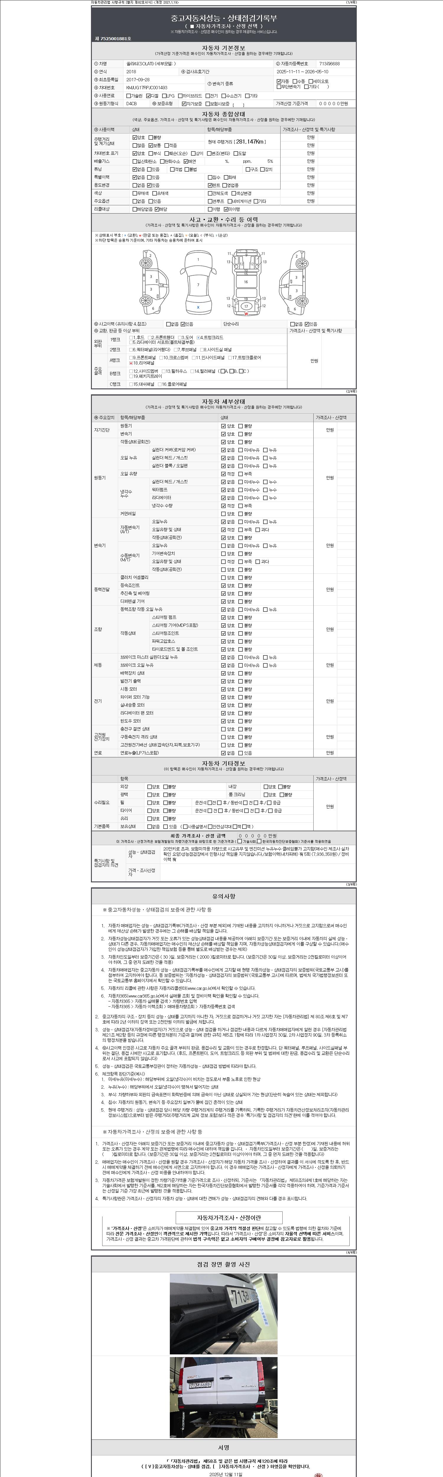 자동차관리법 시행규칙 제120조의 규정에 따라 별지 제 82호서식 《중고자동차 성능, 상태점검 기록부》를 발행한 성능, 상태점검자 및 매매자는 아래의 보증기간 또는 보증거리 이내의 중고자동차, 성능점검 기록부에 기재된 내용과 자동차의 실제 성능, 상태가 다른 경우 계약 또는 관계법령에 따라 매수인에 대하여 책임을 집니다.