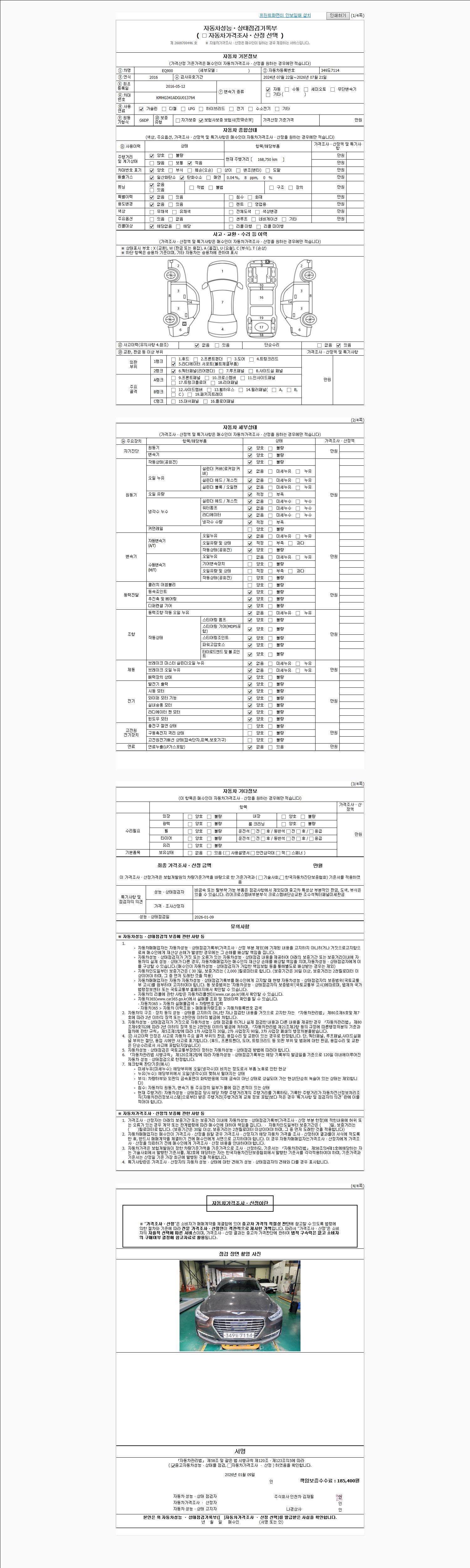 | 주행거리 | 168,658 km | 차량번호 | 349도7114 | 사고유무 | 성능기록부 참조 | 제시번호 | 제 2026001604 호 |