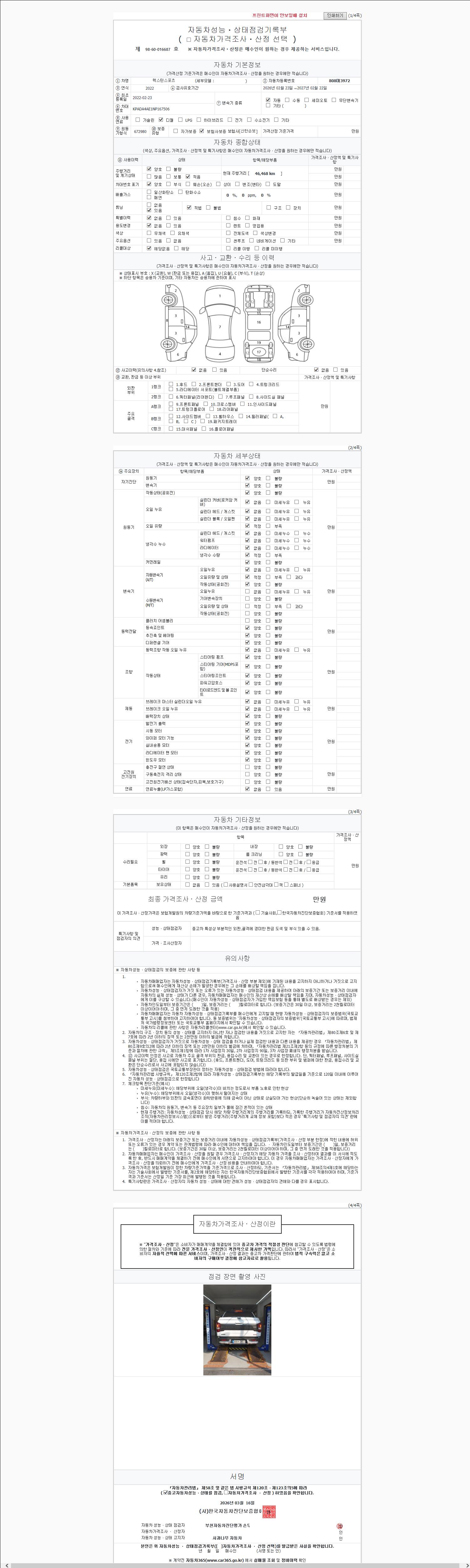 | 주행거리 | 46,470 km | 차량번호 | 808머3972 | 사고유무 | 성능기록부 참조 | 제시번호 | 제 2026047036 호 |