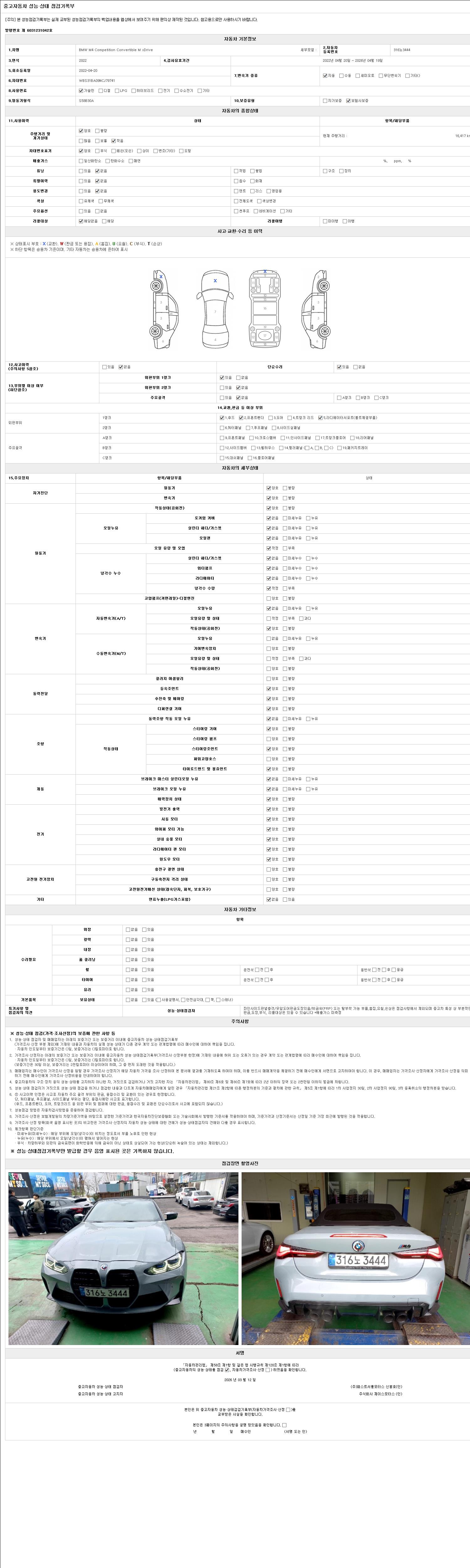 | 주행거리 | 16,417 km | 차량번호 | 316노3444 | 사고유무 | 성능기록부 참조 | 제시번호 | 제 2026008248 호 |
