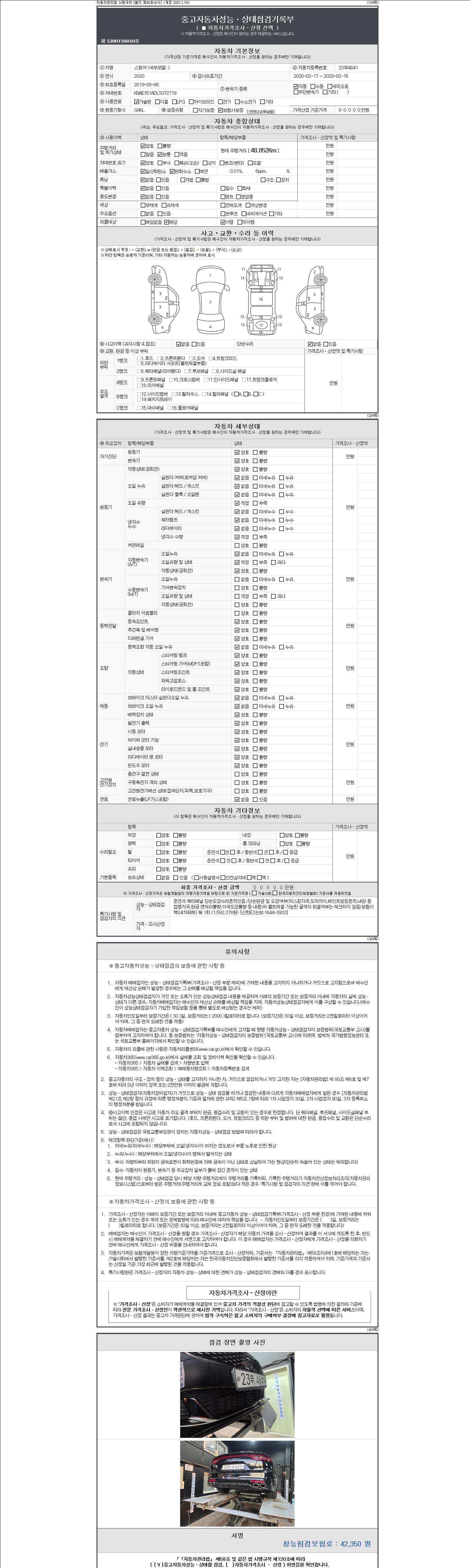 자동차관리법 시행규칙 제120조의 규정에 따라 별지 제 82호서식 《중고자동차 성능, 상태점검 기록부》를 발행한 성능, 상태점검자 및 매매자는 아래의 보증기간 또는 보증거리 이내의 중고자동차, 성능점검 기록부에 기재된 내용과 자동차의 실제 성능, 상태가 다른 경우 계약 또는 관계법령에 따라 매수인에 대하여 책임을 집니다.