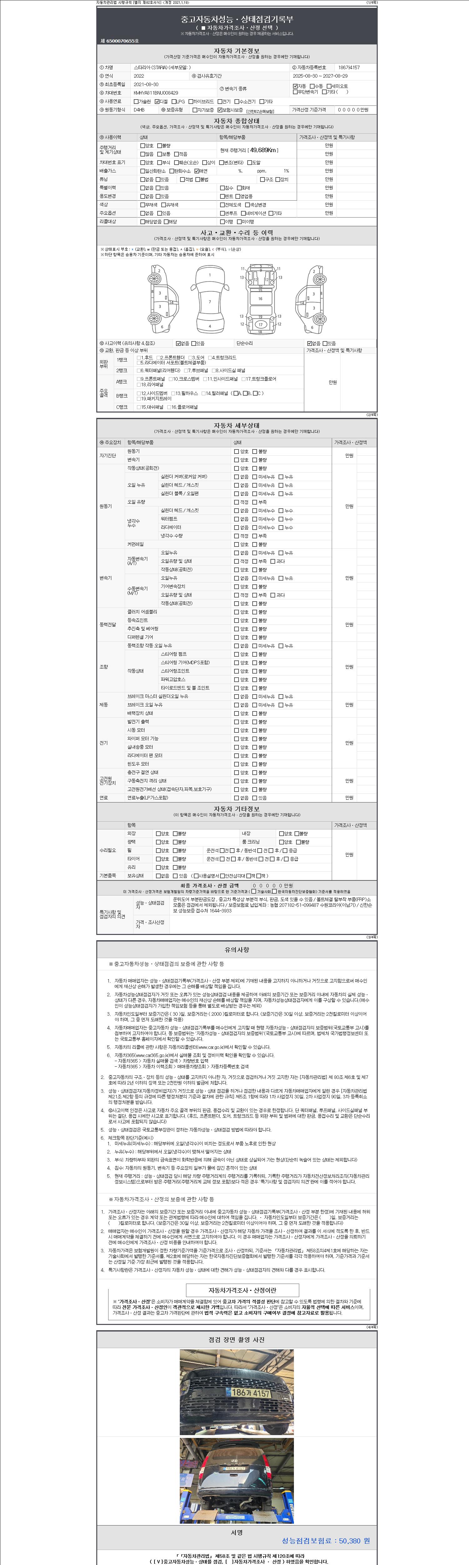 | 주행거리 | 49,689 km | 차량번호 | 186가4157 | 사고유무 | 성능기록부 참조 | 제시번호 | 제 2147483647 호 |