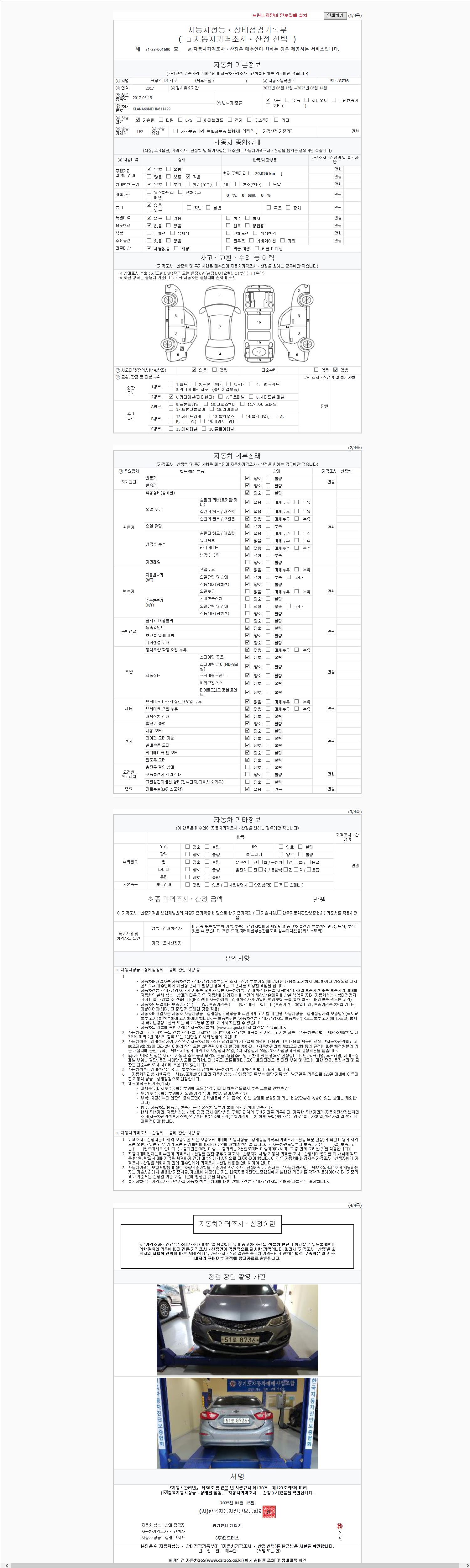 | 주행거리 | 79,026 km | 차량번호 | 51로8736 | 사고유무 | 성능기록부 참조 | 제시번호 | 제 2147483647 호 |