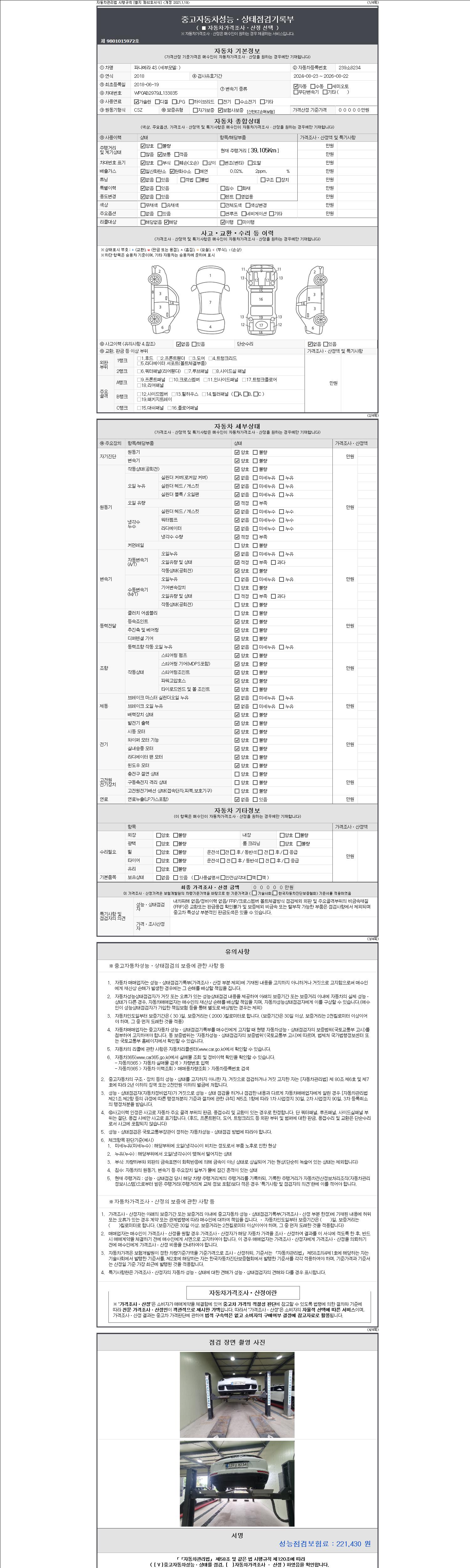 | 주행거리 | 39,029 km | 차량번호 | 239소8234 | 사고유무 | 성능기록부 참조 | 제시번호 | 제 2147483647 호 |