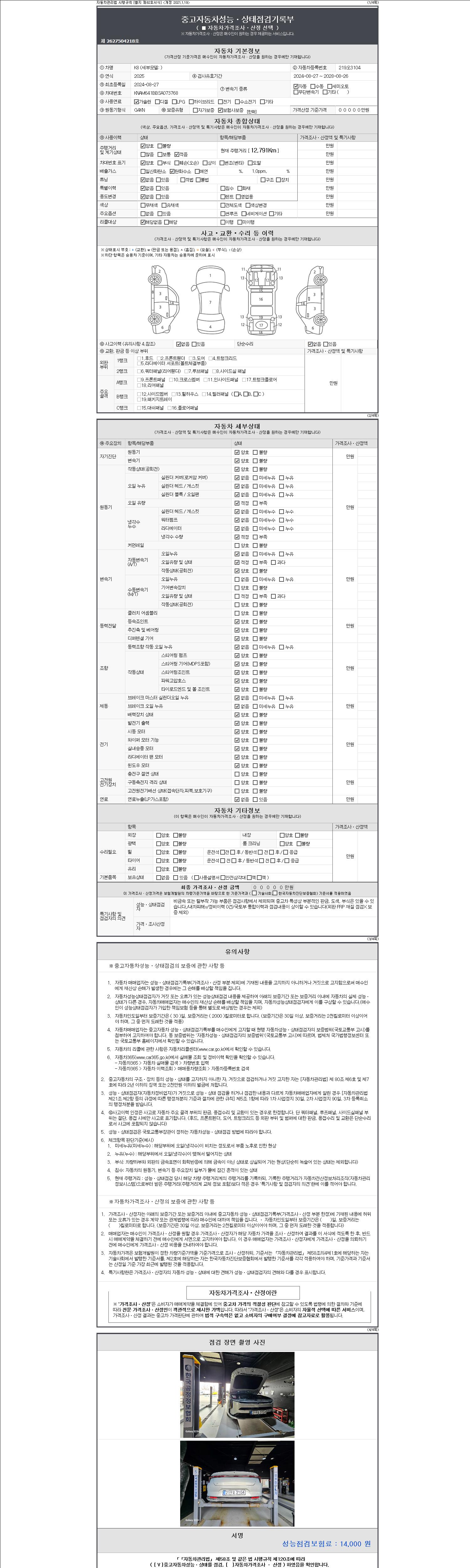 자동차관리법 시행규칙 제120조의 규정에 따라 별지 제 82호서식 《중고자동차 성능, 상태점검 기록부》를 발행한 성능, 상태점검자 및 매매자는 아래의 보증기간 또는 보증거리 이내의 중고자동차, 성능점검 기록부에 기재된 내용과 자동차의 실제 성능, 상태가 다른 경우 계약 또는 관계법령에 따라 매수인에 대하여 책임을 집니다.