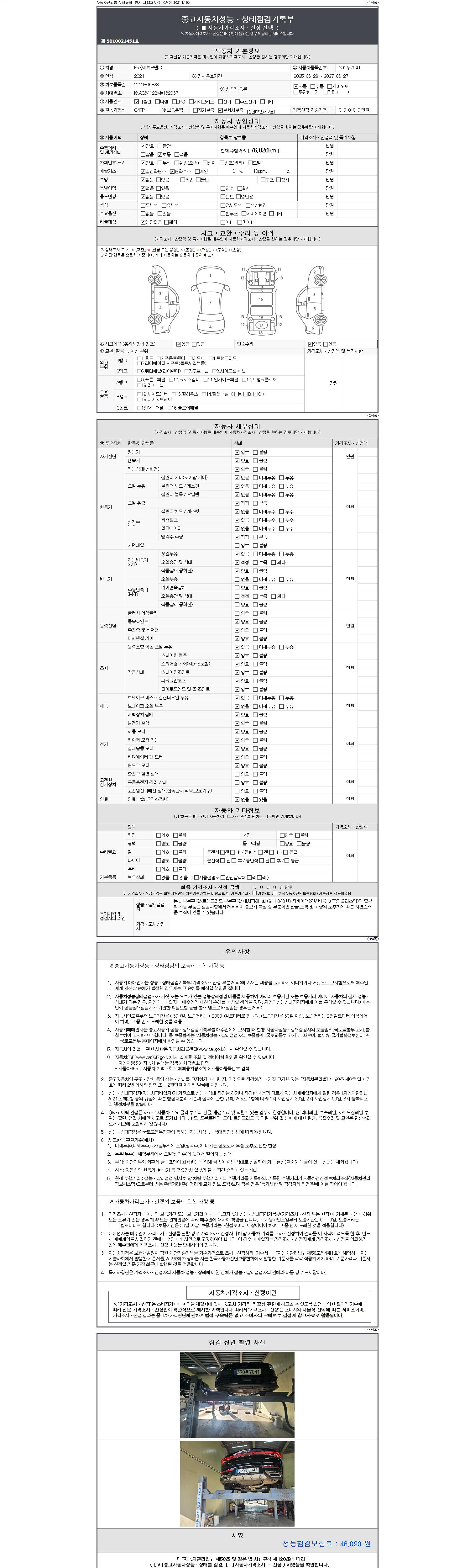자동차관리법 시행규칙 제120조의 규정에 따라 별지 제 82호서식 《중고자동차 성능, 상태점검 기록부》를 발행한 성능, 상태점검자 및 매매자는 아래의 보증기간 또는 보증거리 이내의 중고자동차, 성능점검 기록부에 기재된 내용과 자동차의 실제 성능, 상태가 다른 경우 계약 또는 관계법령에 따라 매수인에 대하여 책임을 집니다.