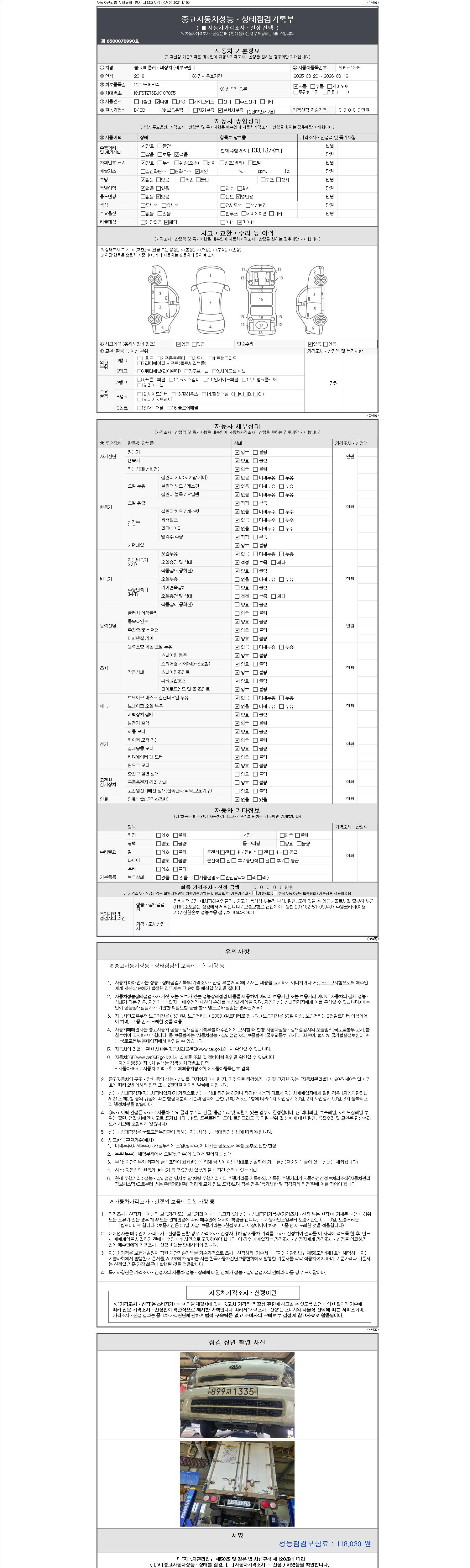 | 주행거리 | 133,137 km | 차량번호 | 899저1335 | 사고유무 | 성능기록부 참조 | 제시번호 | 제 2147483647 호 |
