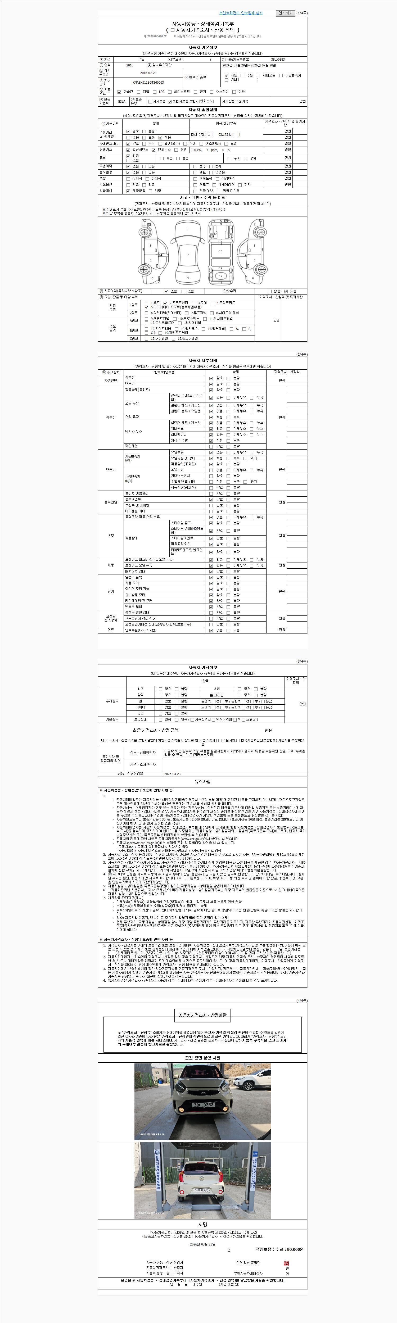 | 주행거리 | 93,175 km | 차량번호 | 38다0383 | 사고유무 | 성능기록부 참조 | 제시번호 | 제 2026015079 호 |