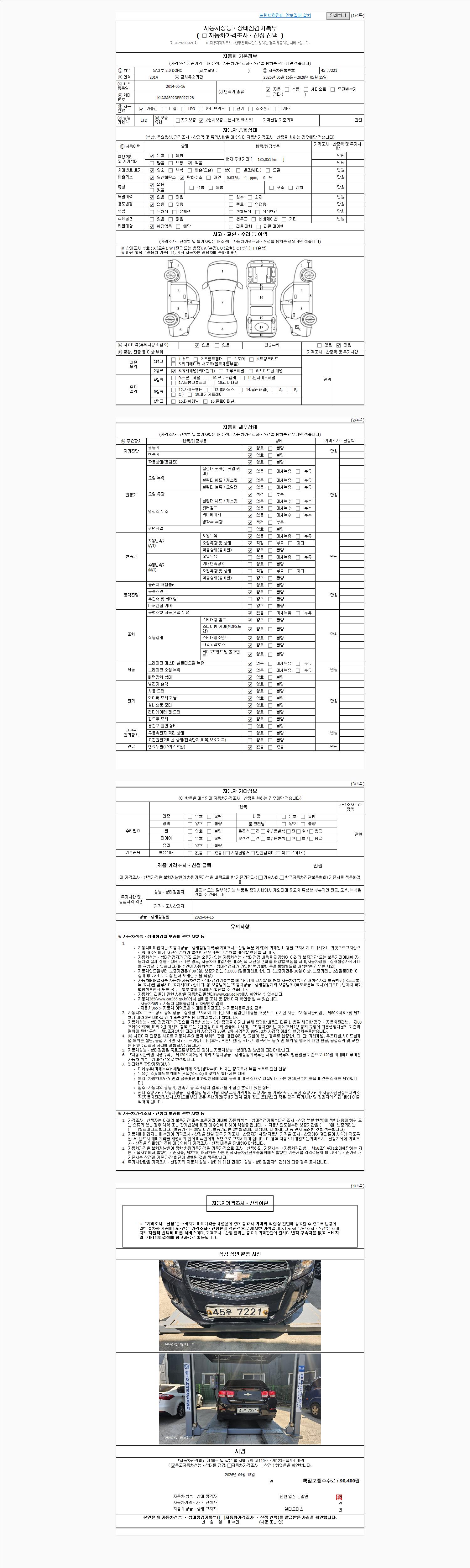| 주행거리 | 135,051 km | 차량번호 | 45우7221 | 사고유무 | 성능기록부 참조 | 제시번호 | 제 2026016308 호 |