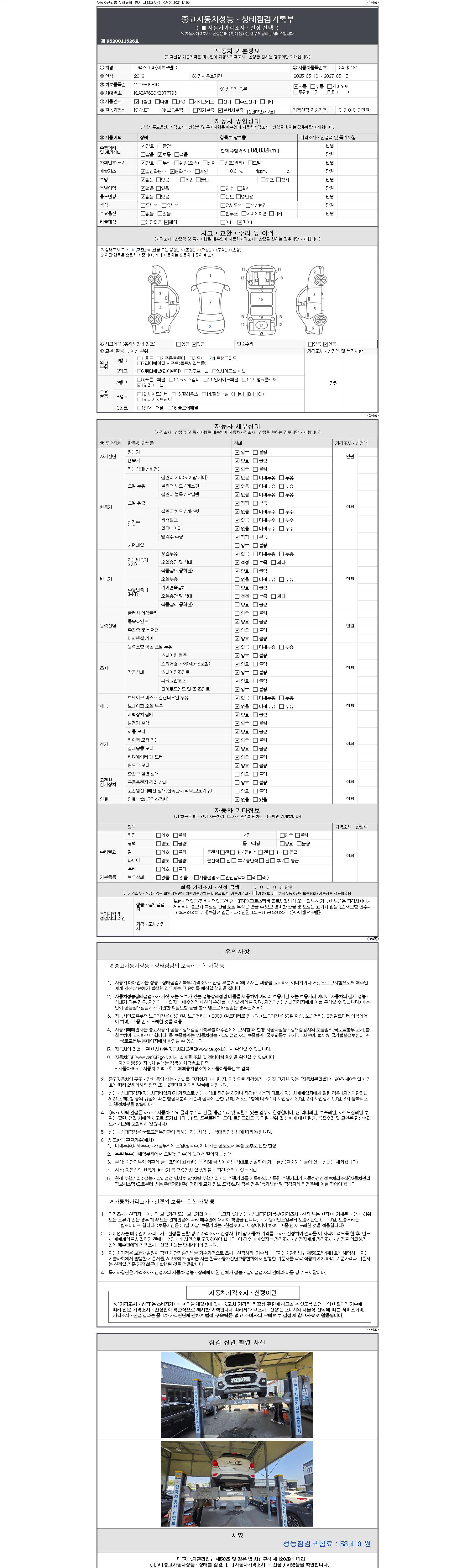 자동차관리법 시행규칙 제120조의 규정에 따라 별지 제 82호서식 《중고자동차 성능, 상태점검 기록부》를 발행한 성능, 상태점검자 및 매매자는 아래의 보증기간 또는 보증거리 이내의 중고자동차, 성능점검 기록부에 기재된 내용과 자동차의 실제 성능, 상태가 다른 경우 계약 또는 관계법령에 따라 매수인에 대하여 책임을 집니다.
