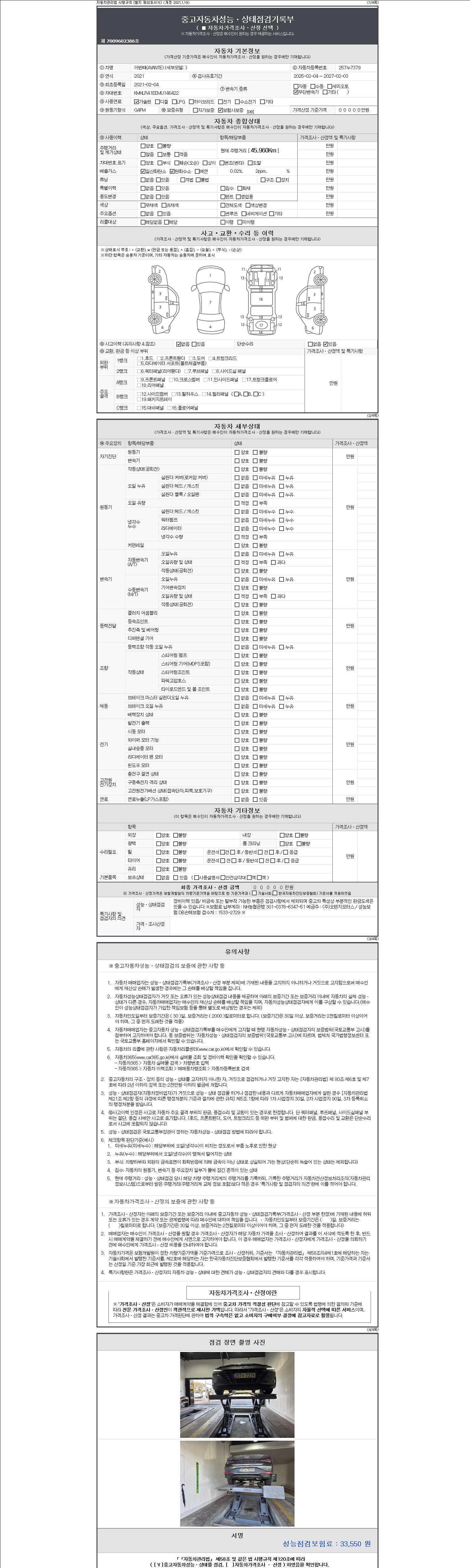 자동차관리법 시행규칙 제120조의 규정에 따라 별지 제 82호서식 《중고자동차 성능, 상태점검 기록부》를 발행한 성능, 상태점검자 및 매매자는 아래의 보증기간 또는 보증거리 이내의 중고자동차, 성능점검 기록부에 기재된 내용과 자동차의 실제 성능, 상태가 다른 경우 계약 또는 관계법령에 따라 매수인에 대하여 책임을 집니다.