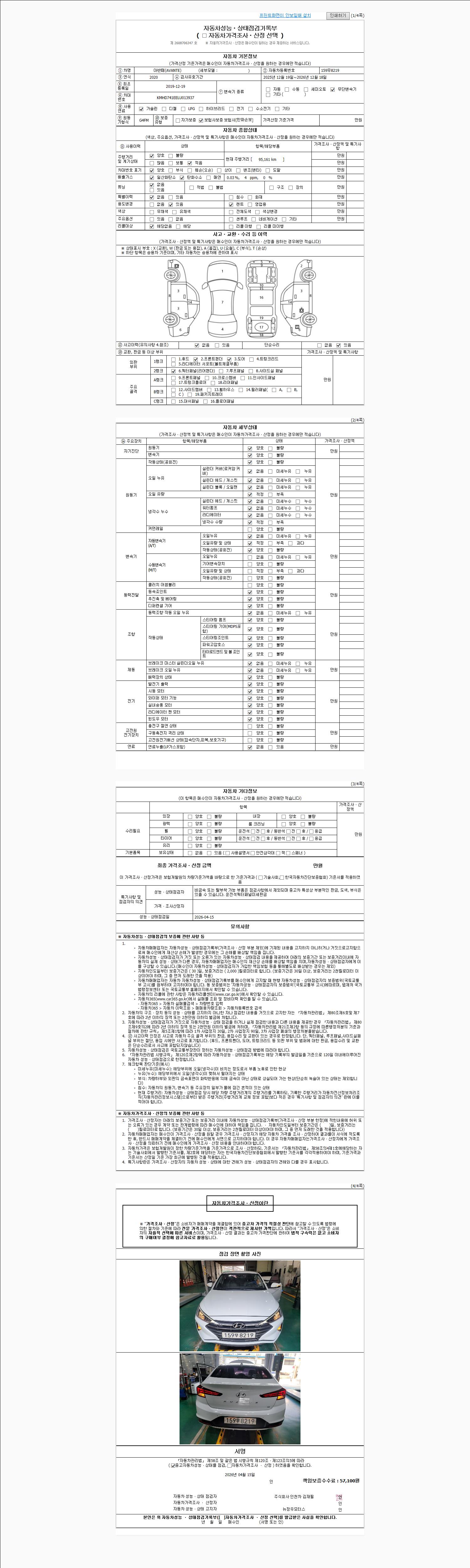 | 주행거리 | 95,161 km | 차량번호 | 159무8219 | 사고유무 | 성능기록부 참조 | 제시번호 | 제 2026019617 호 |