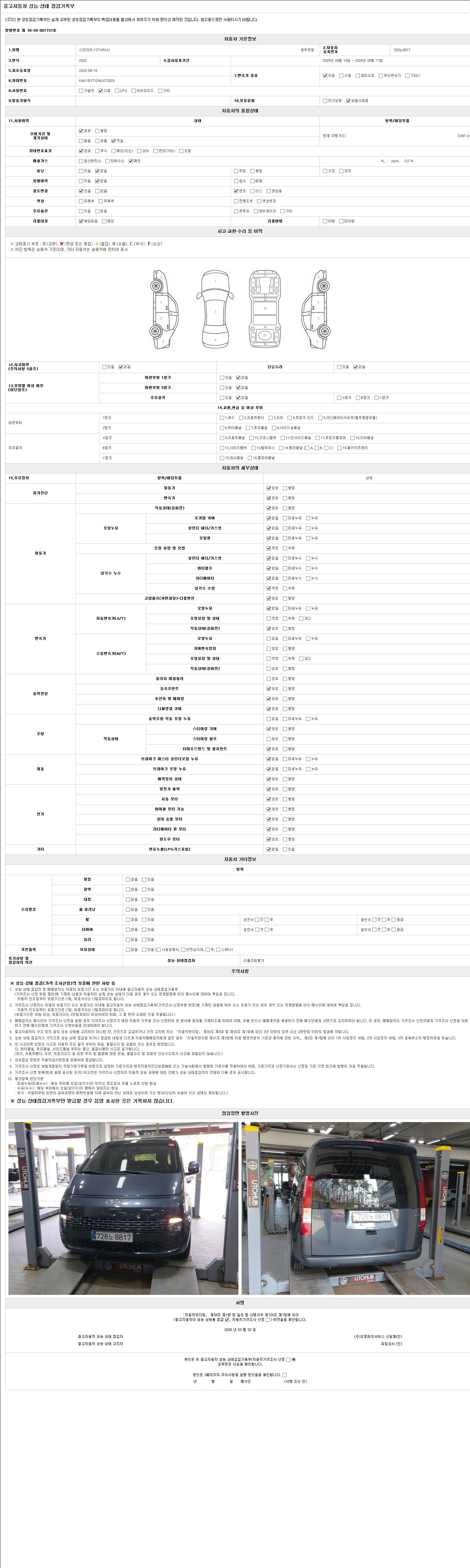 자동차관리법 시행규칙 제120조의 규정에 따라 별지 제 82호서식 《중고자동차 성능, 상태점검 기록부》를 발행한 성능, 상태점검자 및 매매자는 아래의 보증기간 또는 보증거리 이내의 중고자동차, 성능점검 기록부에 기재된 내용과 자동차의 실제 성능, 상태가 다른 경우 계약 또는 관계법령에 따라 매수인에 대하여 책임을 집니다.