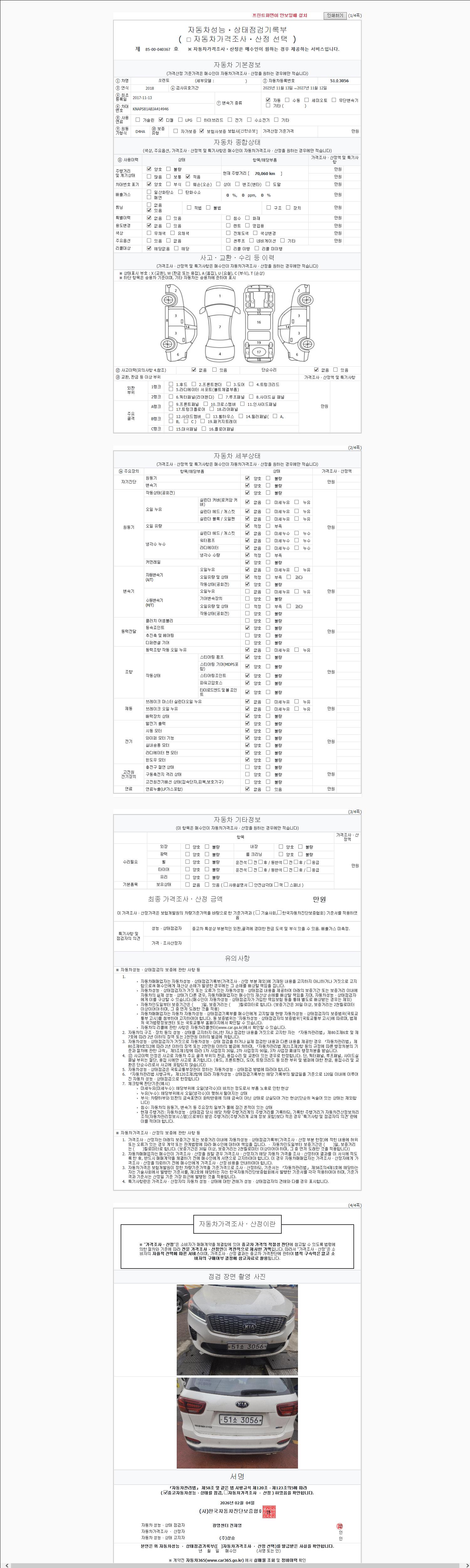 | 주행거리 | 70,038 km | 차량번호 | 51소3056 | 사고유무 | 성능기록부 참조 | 제시번호 | 제 2147483647 호 |