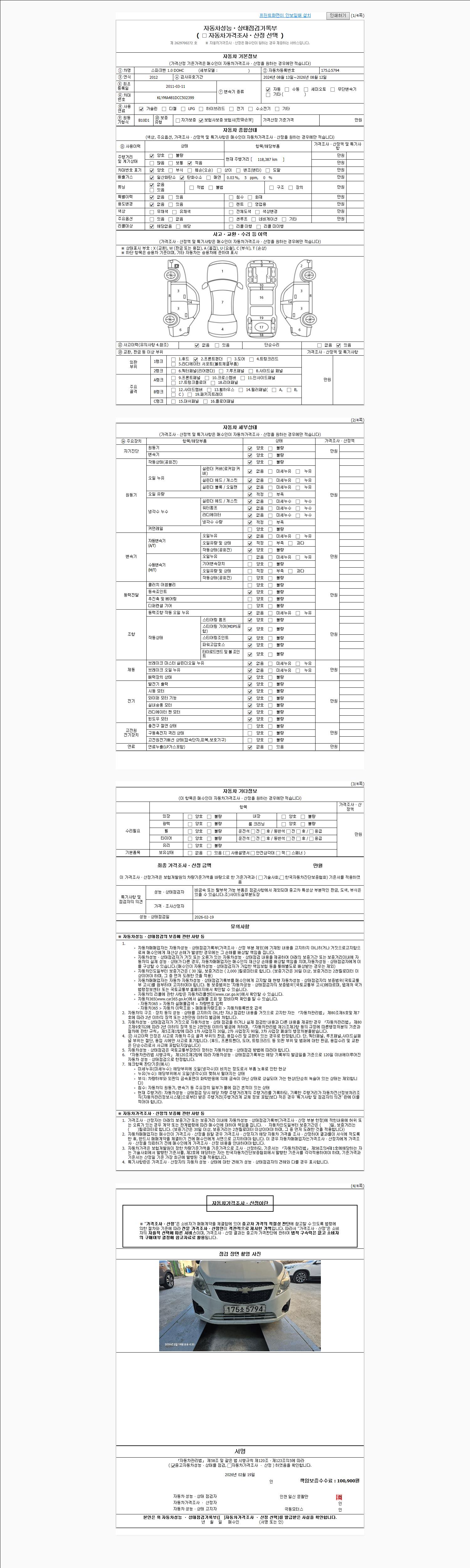 | 주행거리 | 118,387 km | 차량번호 | 175소5794 | 사고유무 | 성능기록부 참조 | 제시번호 | 제 2026008767 호 |