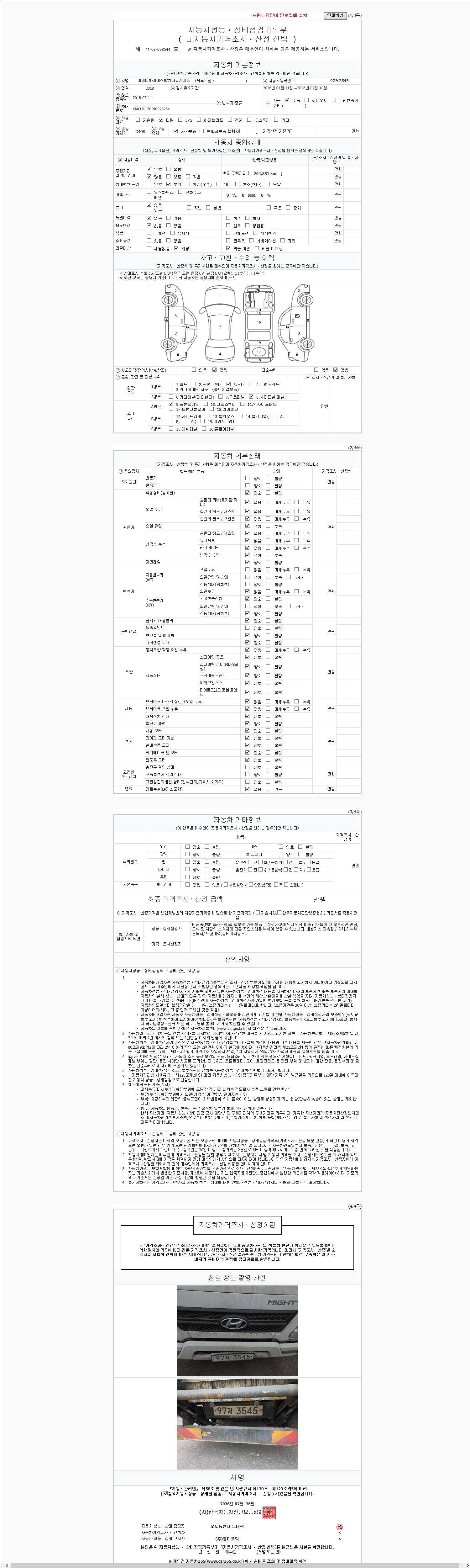 | 주행거리 | 264,880 km | 차량번호 | 97저3545 | 사고유무 | 성능기록부 참조 | 제시번호 | 제 2147483647 호 |
