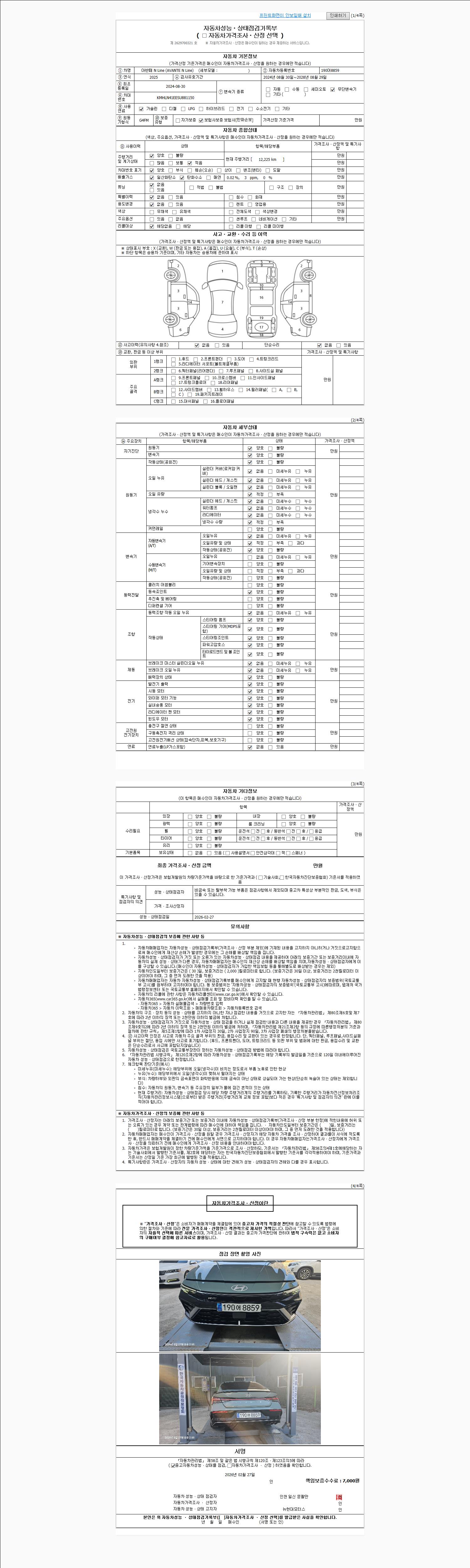 | 주행거리 | 12,225 km | 차량번호 | 190어8859 | 사고유무 | 성능기록부 참조 | 제시번호 | 제 2026010663 호 |
