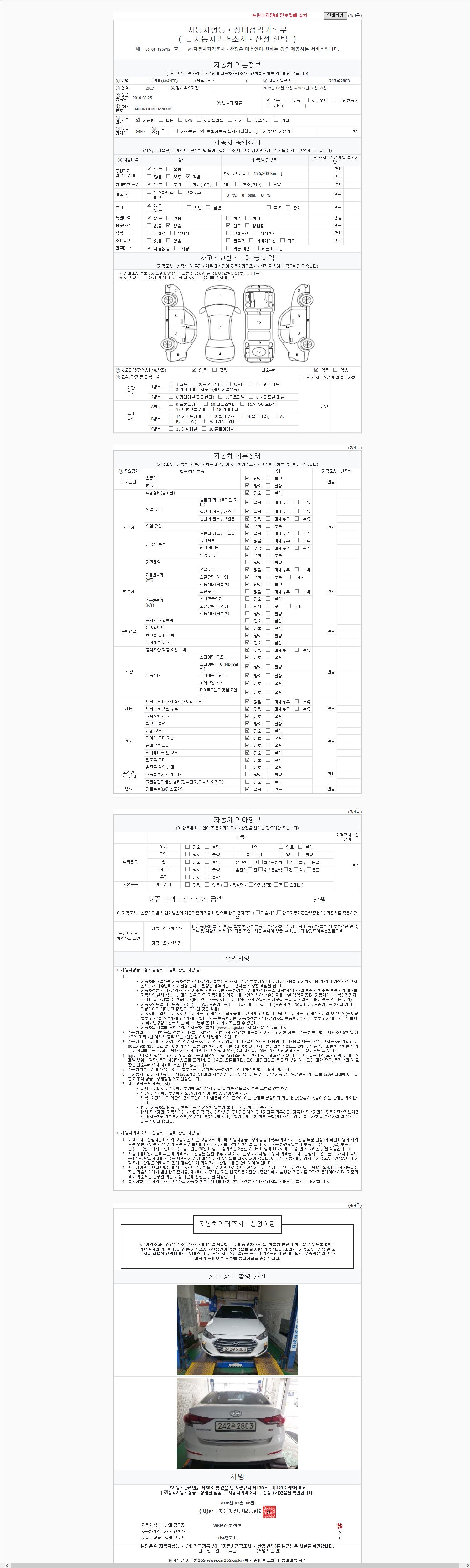 | 주행거리 | 126,803 km | 차량번호 | 242우2803 | 사고유무 | 성능기록부 참조 | 제시번호 | 제 2147483647 호 |