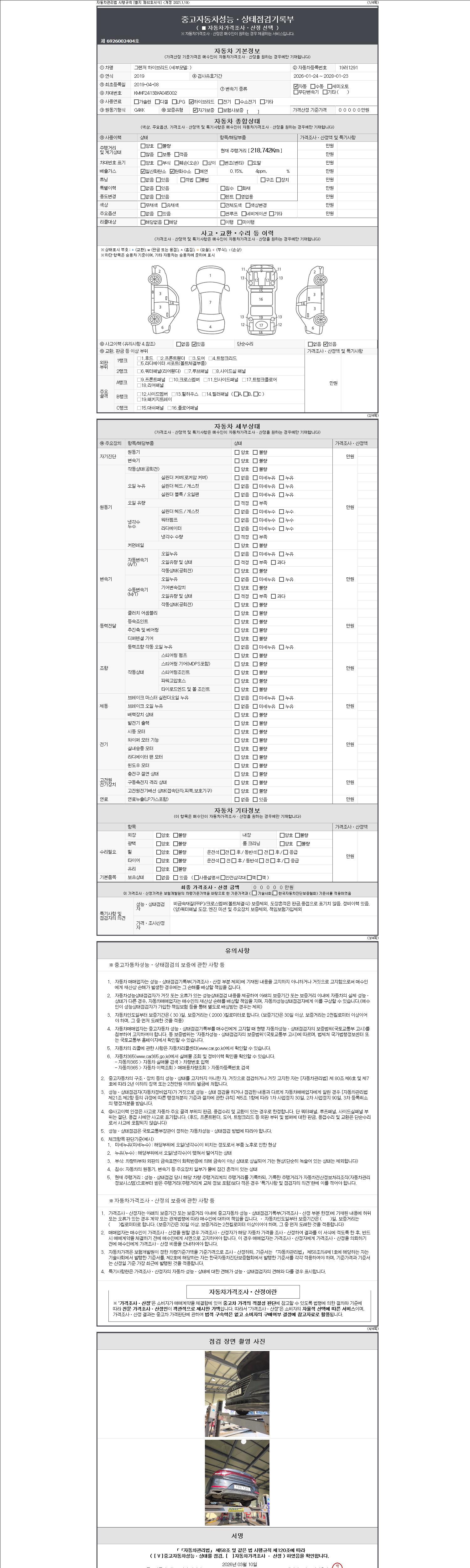 자동차관리법 시행규칙 제120조의 규정에 따라 별지 제 82호서식 《중고자동차 성능, 상태점검 기록부》를 발행한 성능, 상태점검자 및 매매자는 아래의 보증기간 또는 보증거리 이내의 중고자동차, 성능점검 기록부에 기재된 내용과 자동차의 실제 성능, 상태가 다른 경우 계약 또는 관계법령에 따라 매수인에 대하여 책임을 집니다.