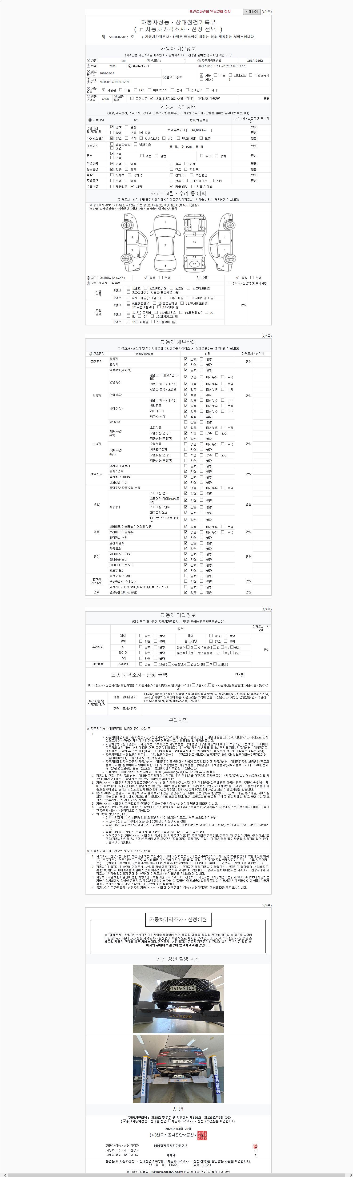 | 주행거리 | 26,087 km | 차량번호 | 161누9162 | 사고유무 | 성능기록부 참조 | 제시번호 | 제 2147483647 호 |