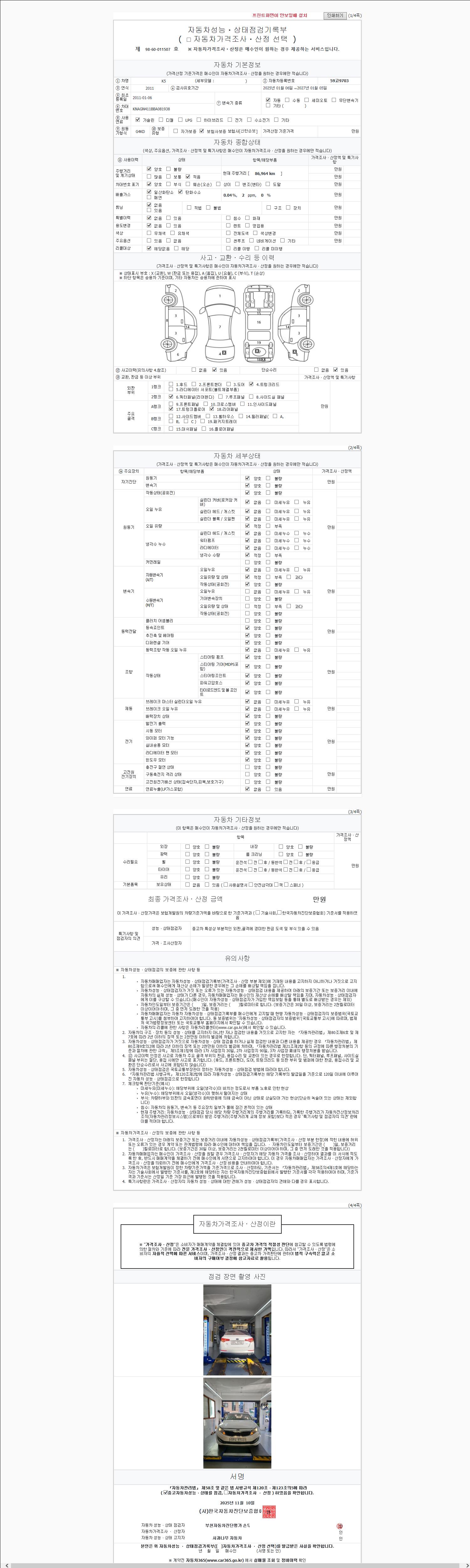 | 주행거리 | 86,964 km | 차량번호 | 59고9703 | 사고유무 | 성능기록부 참조 | 제시번호 | 제 2025207363 호 |