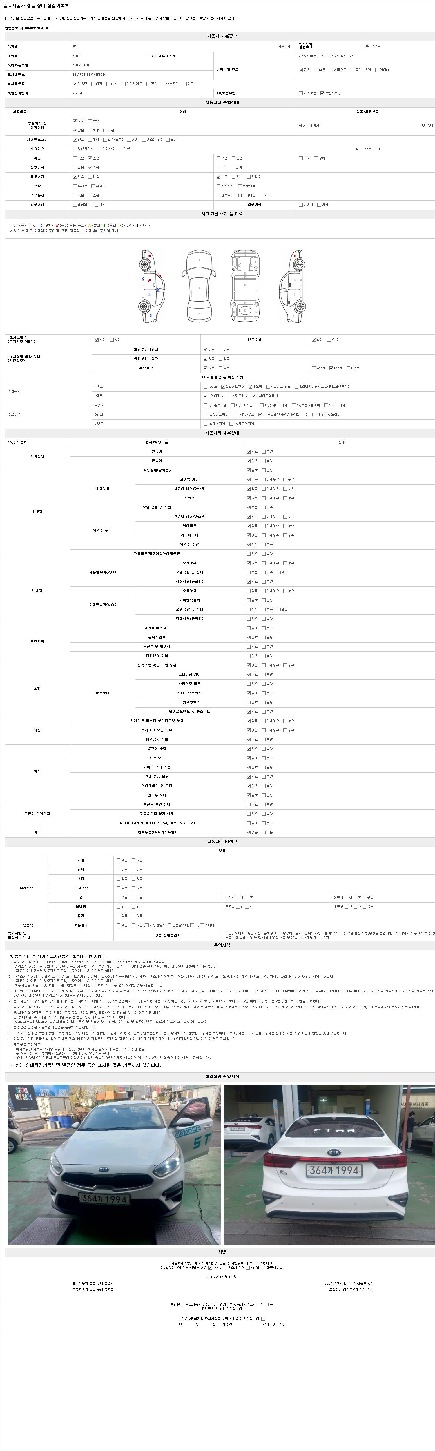 | 주행거리 | 163,143 km | 차량번호 | 364가1994 | 사고유무 | 성능기록부 참조 | 제시번호 | 제 2026010640 호 |