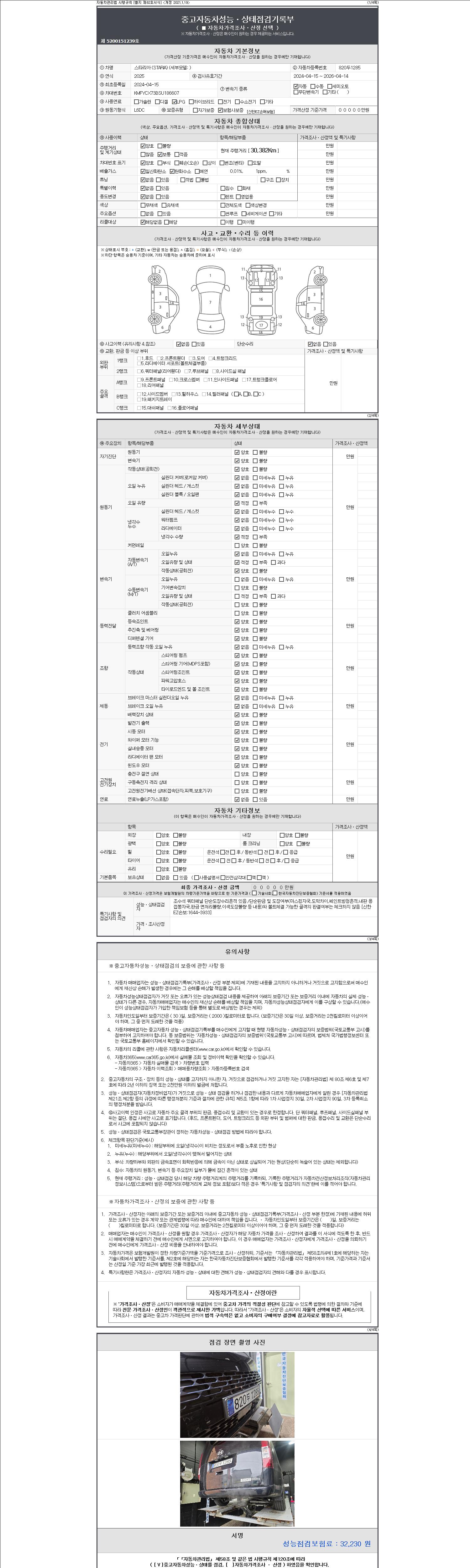 자동차관리법 시행규칙 제120조의 규정에 따라 별지 제 82호서식 《중고자동차 성능, 상태점검 기록부》를 발행한 성능, 상태점검자 및 매매자는 아래의 보증기간 또는 보증거리 이내의 중고자동차, 성능점검 기록부에 기재된 내용과 자동차의 실제 성능, 상태가 다른 경우 계약 또는 관계법령에 따라 매수인에 대하여 책임을 집니다.