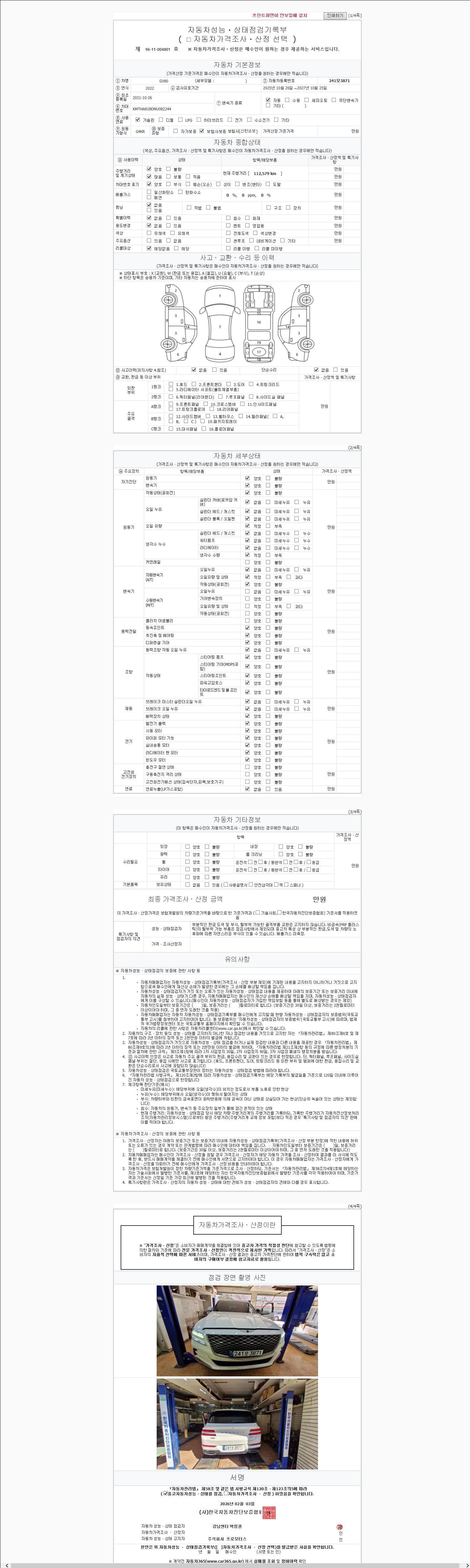 | 주행거리 | 112,579 km | 차량번호 | 241모3871 | 사고유무 | 성능기록부 참조 | 제시번호 | 제 2026014491 호 |