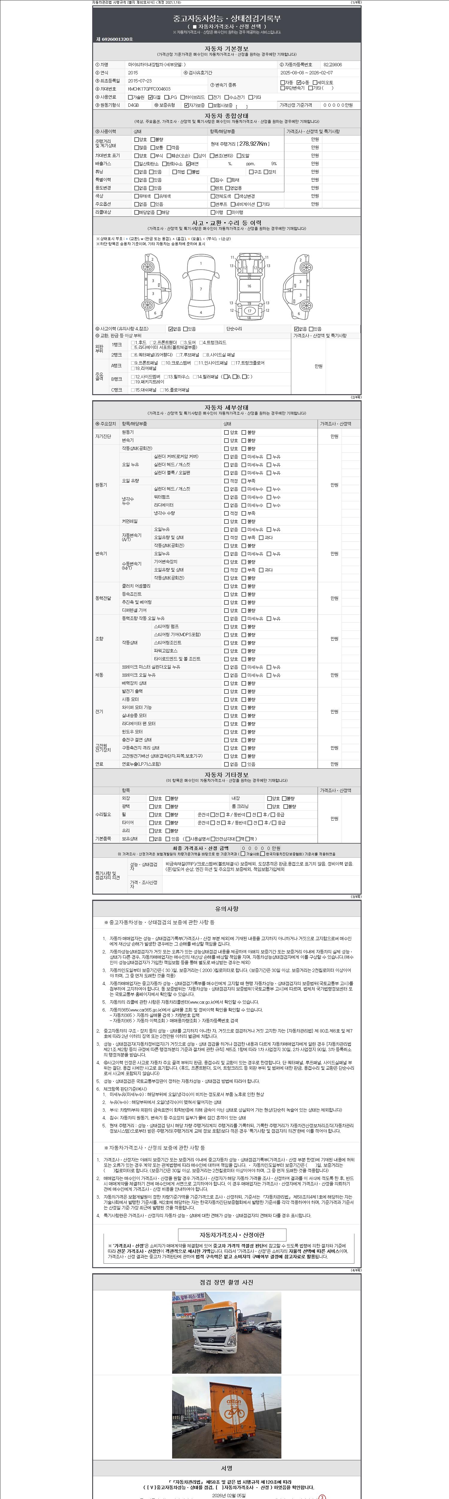 자동차관리법 시행규칙 제120조의 규정에 따라 별지 제 82호서식 《중고자동차 성능, 상태점검 기록부》를 발행한 성능, 상태점검자 및 매매자는 아래의 보증기간 또는 보증거리 이내의 중고자동차, 성능점검 기록부에 기재된 내용과 자동차의 실제 성능, 상태가 다른 경우 계약 또는 관계법령에 따라 매수인에 대하여 책임을 집니다.