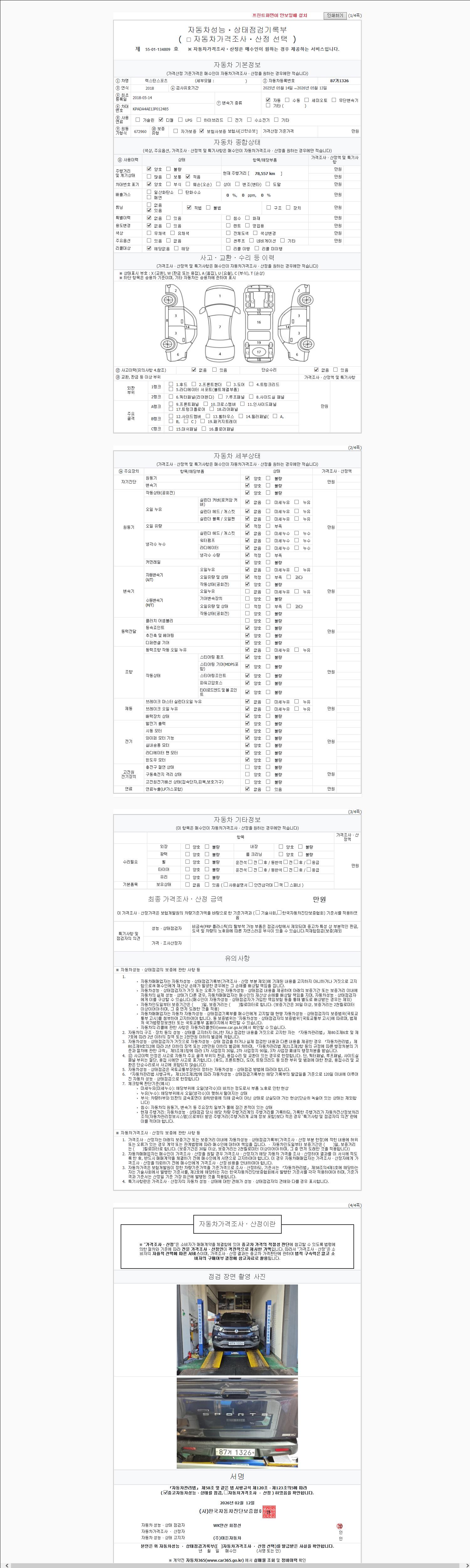 | 주행거리 | 78,557 km | 차량번호 | 87거1326 | 사고유무 | 성능기록부 참조 | 제시번호 | 제 2147483647 호 |