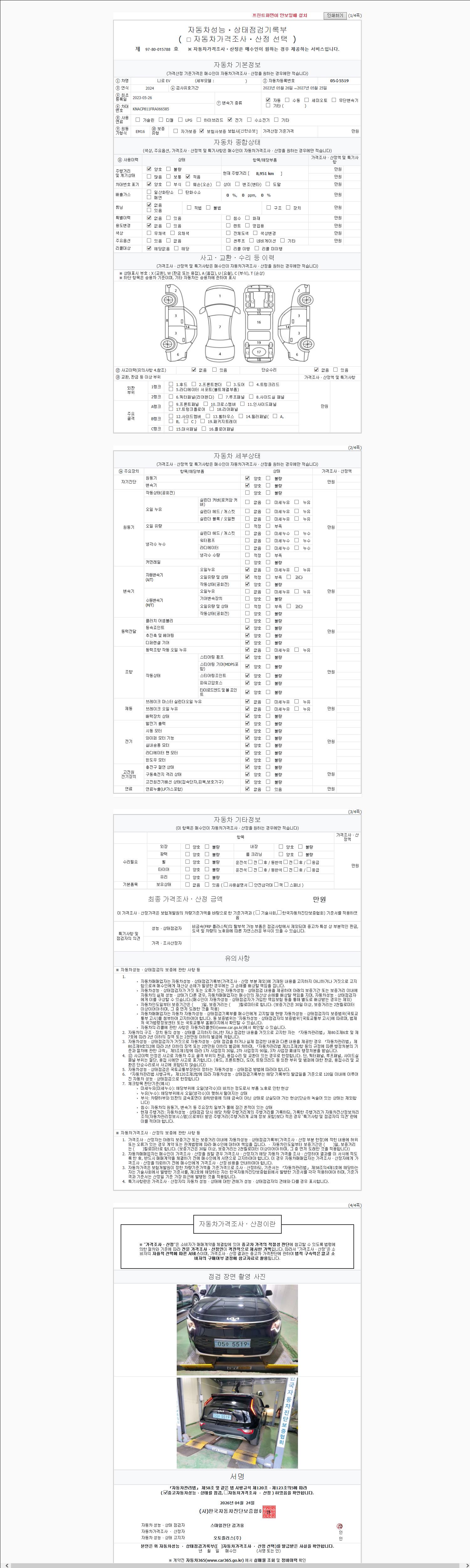 | 주행거리 | 8,951 km | 차량번호 | 05수5519 | 사고유무 | 성능기록부 참조 | 제시번호 | 제 2026013376 호 |