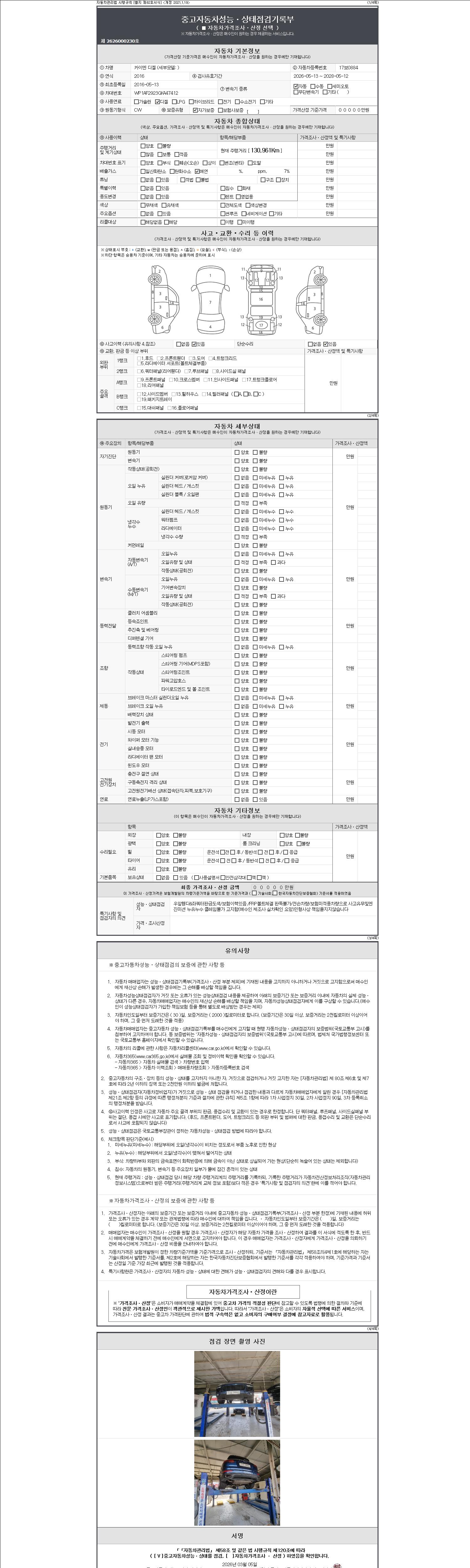 -중고자동차 매매업자를 통해 차량을 구입하실 경우 반드시 "중고자동차 성능, 상태점검 기록부"를 교뷰 받으셔야 하며, 매매업자는 반드시 의무 교부 하여야 압니다.
