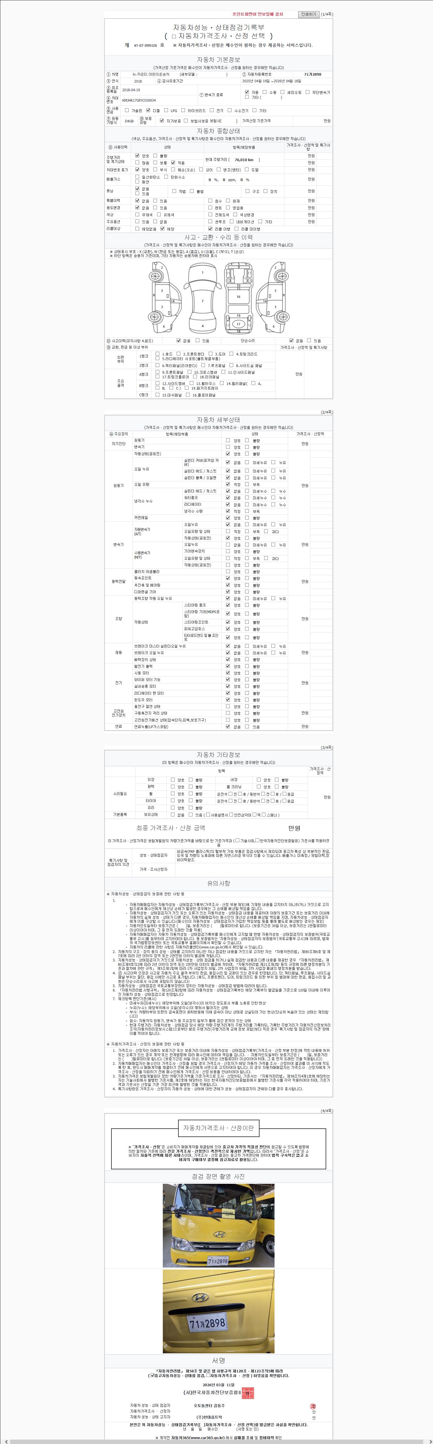 | 주행거리 | 75,991 km | 차량번호 | 71가2898 | 사고유무 | 성능기록부 참조 | 제시번호 | 제 2147483647 호 |