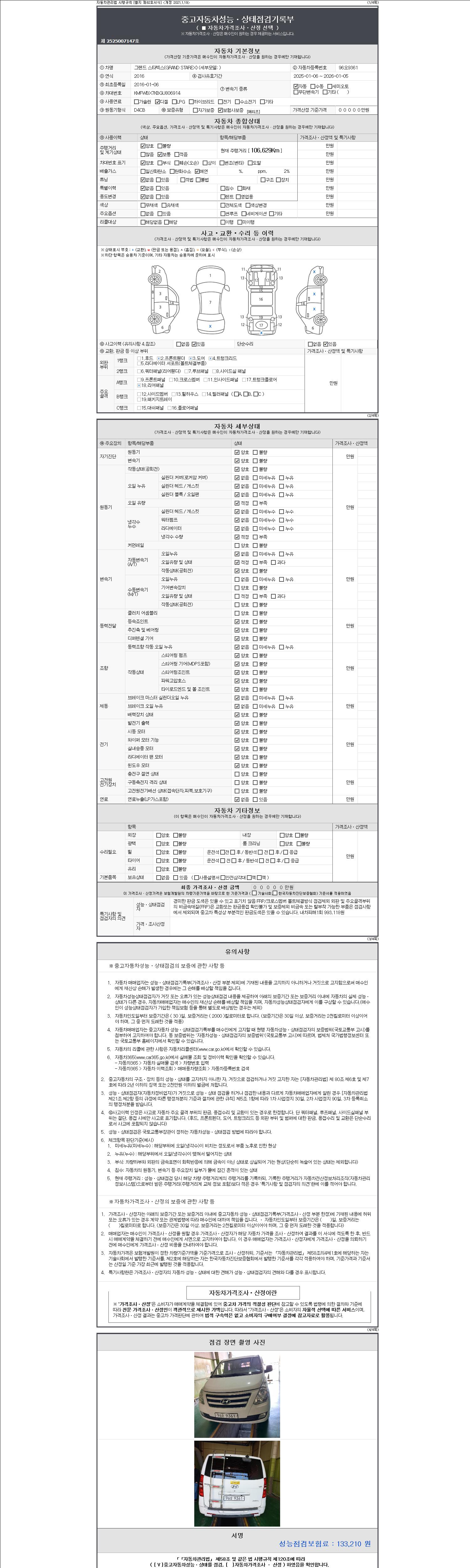 | 주행거리 | 106,629 km | 차량번호 | 96오9361 | 사고유무 | 성능기록부 참조 | 제시번호 | 제 2147483647 호 |