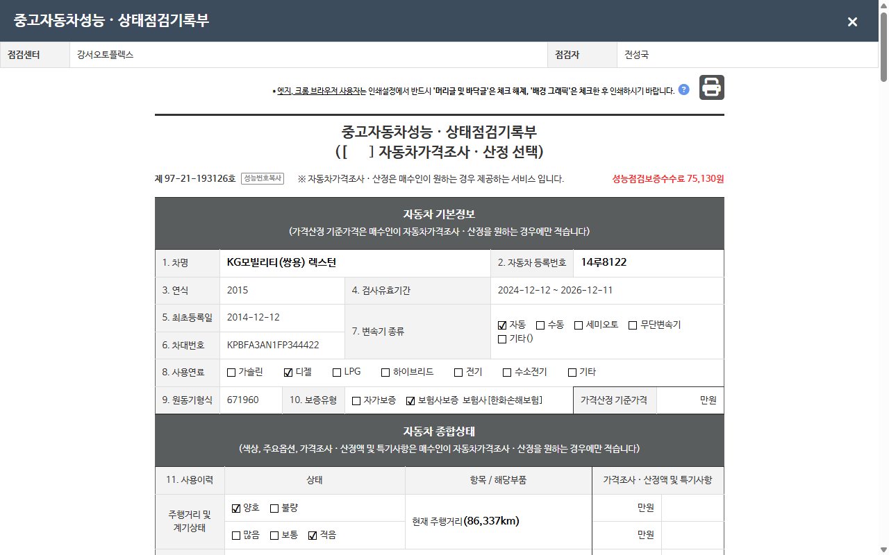 | 주행거리 | 86,337 km | 차량번호 | 14루8122 | 사고유무 | 성능기록부 참조 | 제시번호 | 제 2025149281 호 |