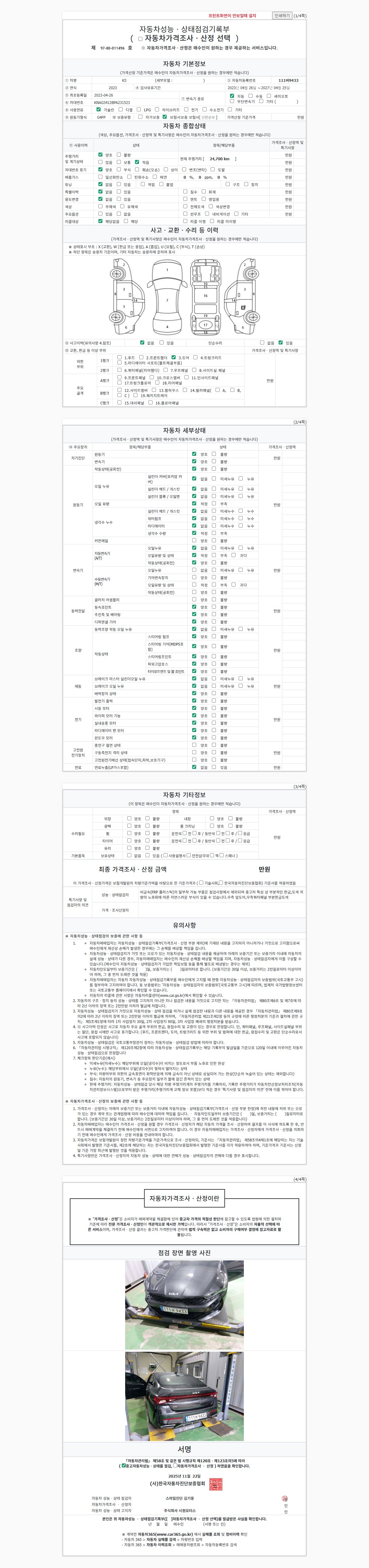 | 주행거리 | 24,692 km | 차량번호 | 111버9433 | 사고유무 | 성능기록부 참조 | 제시번호 | 제 2025159083 호 |