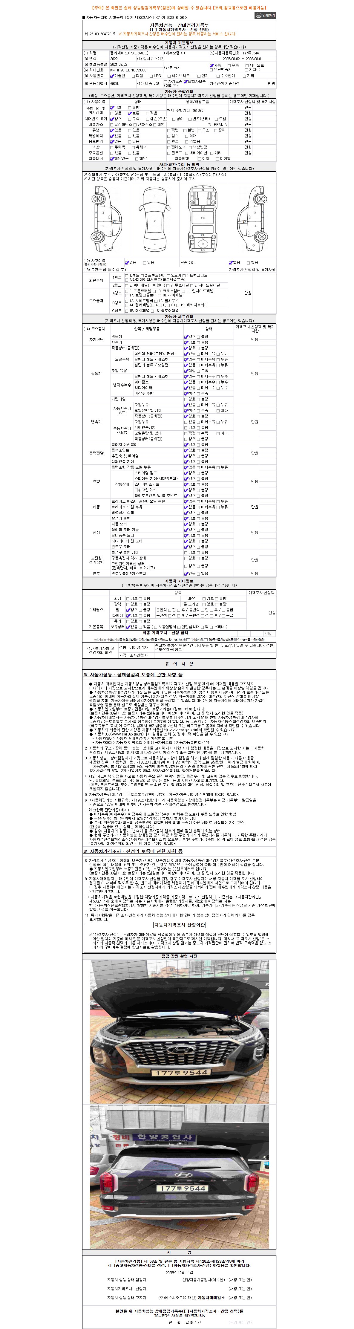자동차관리법 시행규칙 제120조의 규정에 따라 별지 제 82호서식 《중고자동차 성능, 상태점검 기록부》를 발행한 성능, 상태점검자 및 매매자는 아래의 보증기간 또는 보증거리 이내의 중고자동차, 성능점검 기록부에 기재된 내용과 자동차의 실제 성능, 상태가 다른 경우 계약 또는 관계법령에 따라 매수인에 대하여 책임을 집니다.
