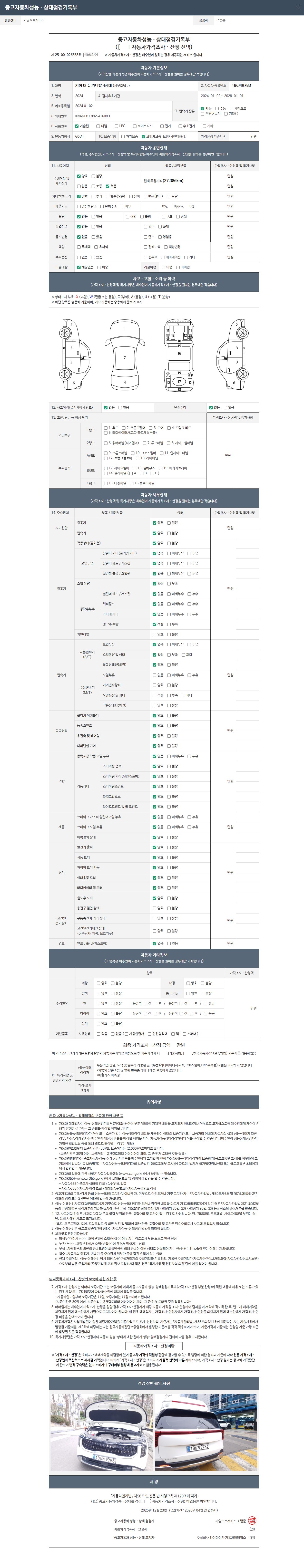 | 주행거리 | 27,389 km | 차량번호 | 186거9783 | 사고유무 | 성능기록부 참조 | 제시번호 | 제 2025174199 호 |