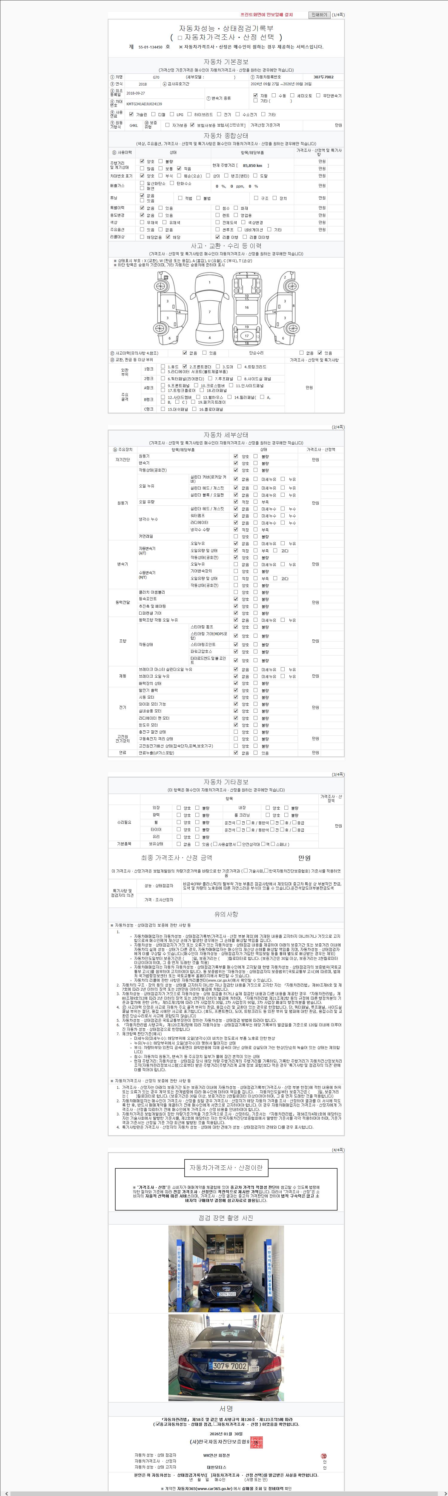 | 주행거리 | 85,850 km | 차량번호 | 307두7002 | 사고유무 | 성능기록부 참조 | 제시번호 | 제 2147483647 호 |