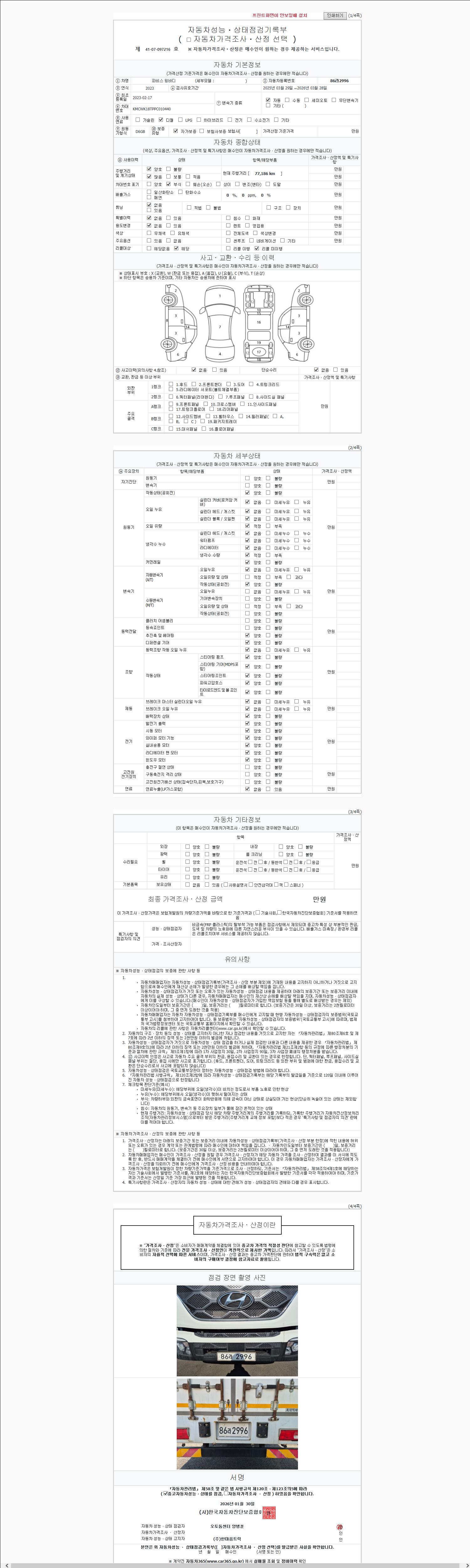 | 주행거리 | 77,186 km | 차량번호 | 86라2996 | 사고유무 | 성능기록부 참조 | 제시번호 | 제 2147483647 호 |