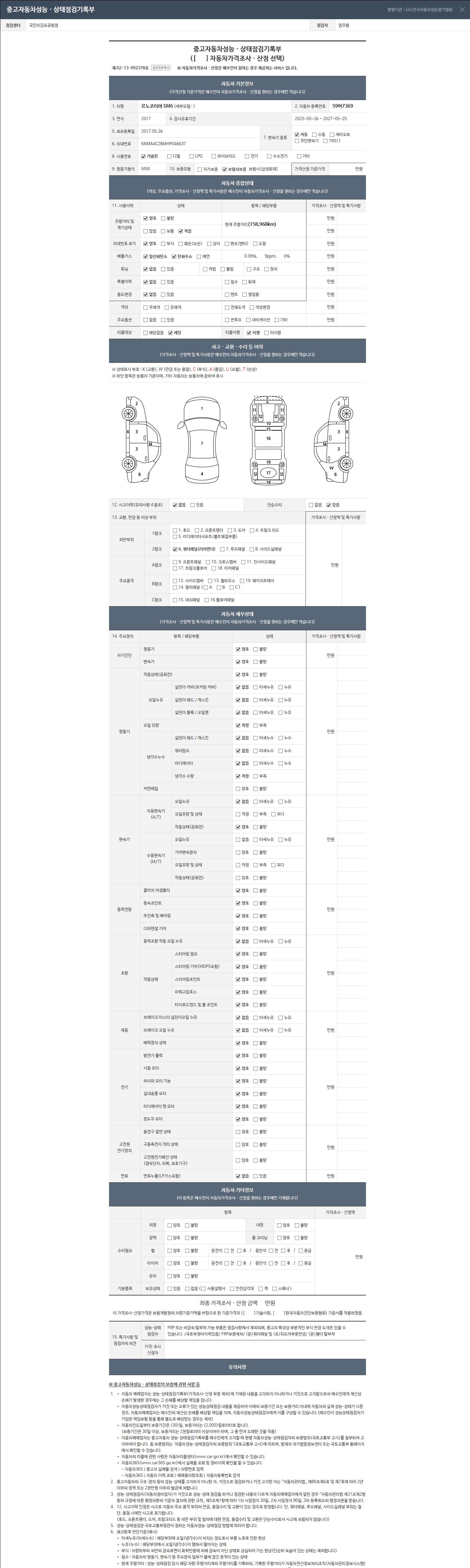 | 주행거리 | 158,968 km | 차량번호 | 59머7369 | 사고유무 | 성능기록부 참조 | 제시번호 | 제 2026038705 호 |