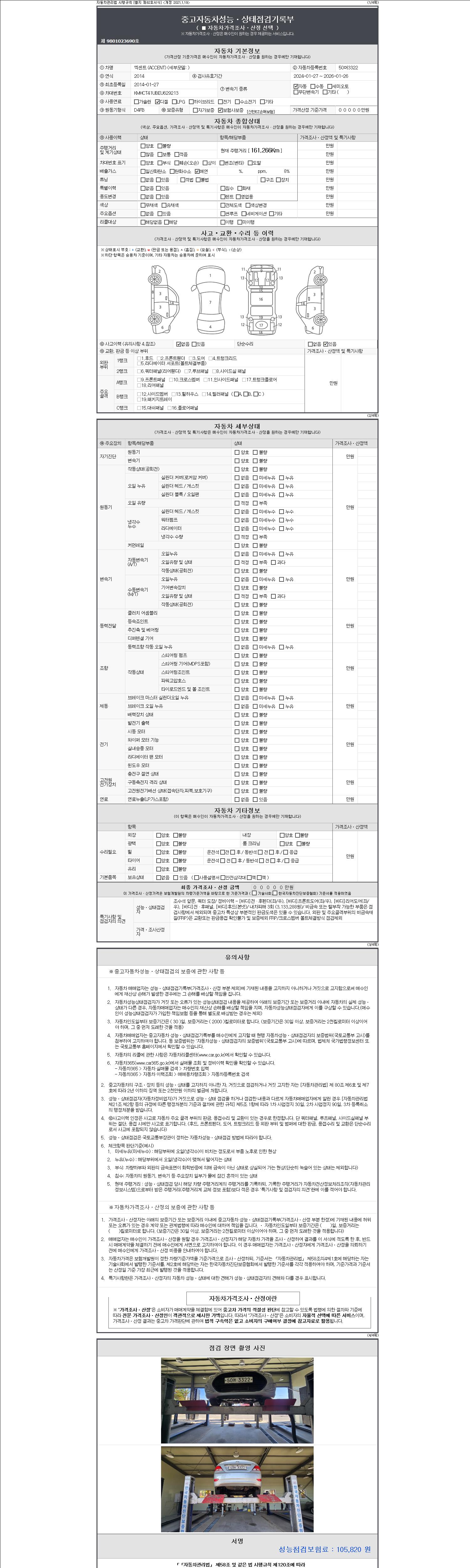 자동차관리법 시행규칙 제120조의 규정에 따라 별지 제 82호서식 《중고자동차 성능, 상태점검 기록부》를 발행한 성능, 상태점검자 및 매매자는 아래의 보증기간 또는 보증거리 이내의 중고자동차, 성능점검 기록부에 기재된 내용과 자동차의 실제 성능, 상태가 다른 경우 계약 또는 관계법령에 따라 매수인에 대하여 책임을 집니다.