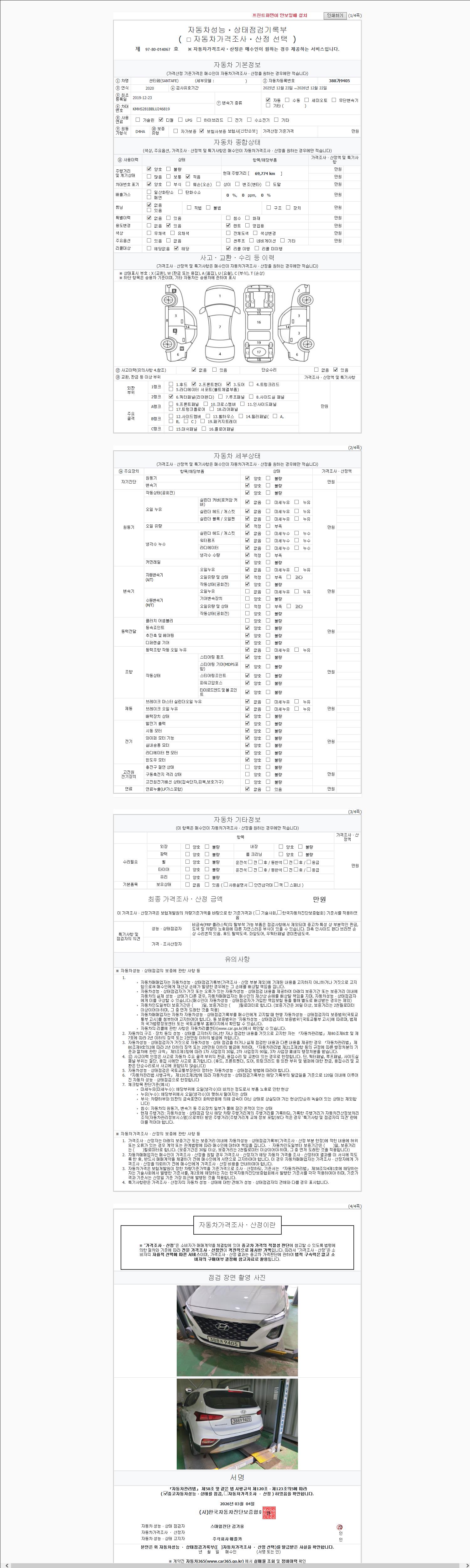 | 주행거리 | 69,684 km | 차량번호 | 388가9405 | 사고유무 | 성능기록부 참조 | 제시번호 | 제 2147483647 호 |