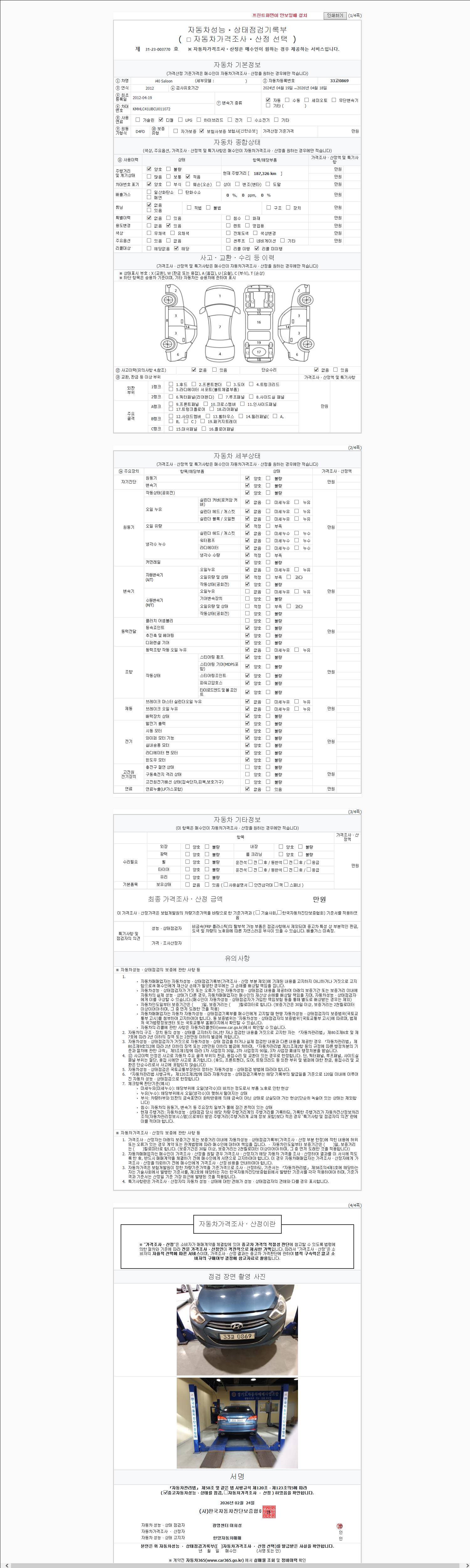 | 주행거리 | 187,326 km | 차량번호 | 33고0869 | 사고유무 | 성능기록부 참조 | 제시번호 | 제 2147483647 호 |