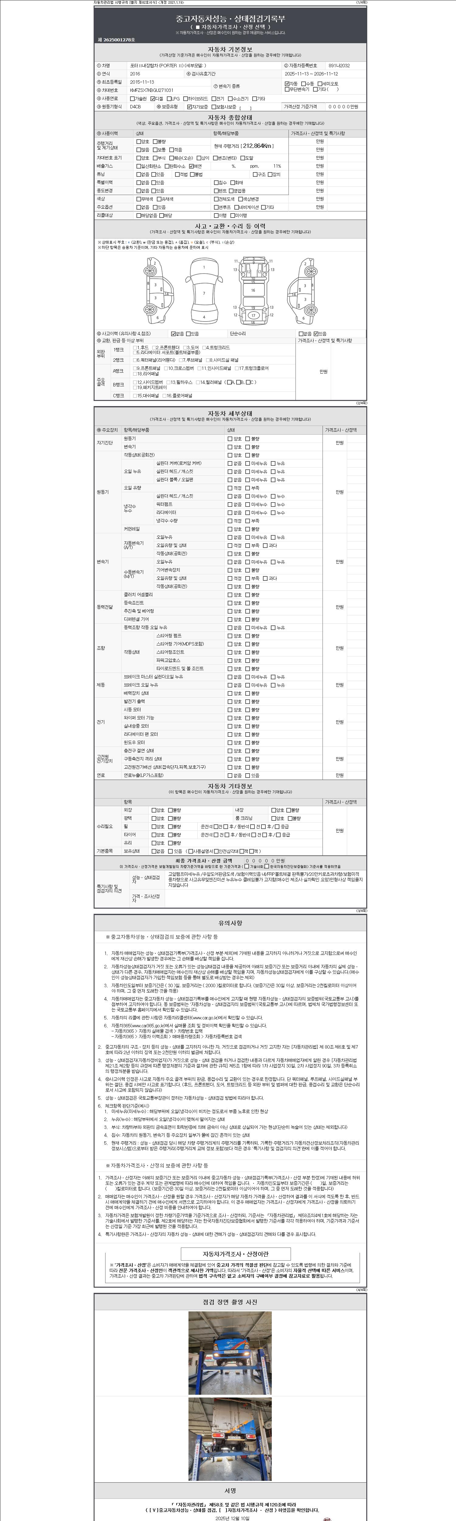 -중고자동차 매매업자를 통해 차량을 구입하실 경우 반드시 "중고자동차 성능, 상태점검 기록부"를 교뷰 받으셔야 하며, 매매업자는 반드시 의무 교부 하여야 압니다.