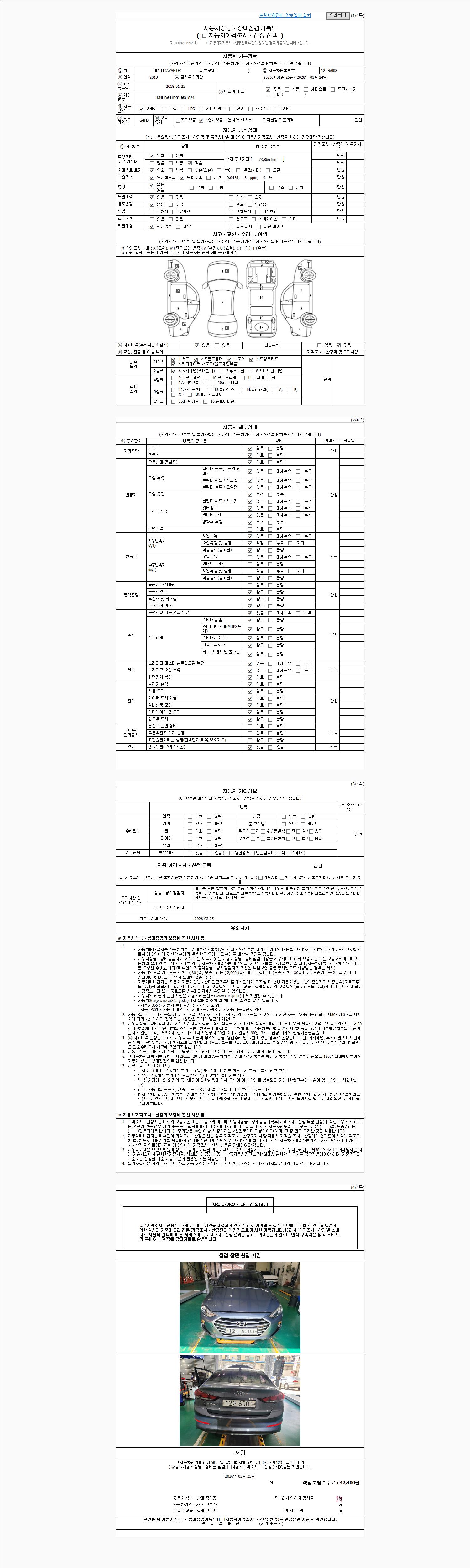 | 주행거리 | 73,735 km | 차량번호 | 12가6003 | 사고유무 | 성능기록부 참조 | 제시번호 | 제 2026014526 호 |