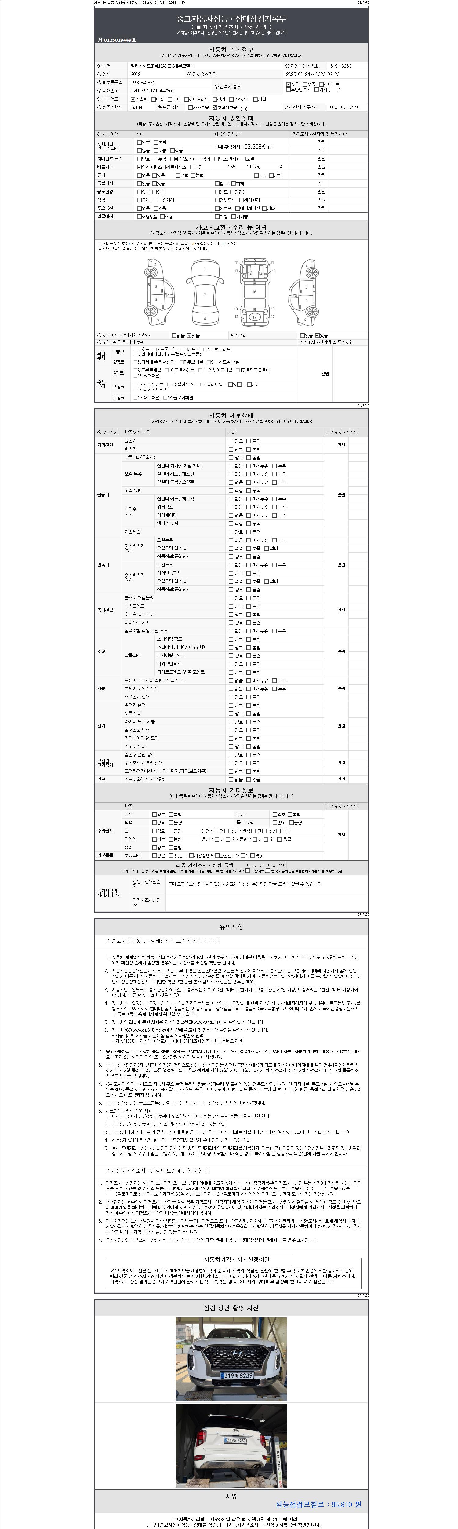 자동차관리법 시행규칙 제120조의 규정에 따라 별지 제 82호서식 《중고자동차 성능, 상태점검 기록부》를 발행한 성능, 상태점검자 및 매매자는 아래의 보증기간 또는 보증거리 이내의 중고자동차, 성능점검 기록부에 기재된 내용과 자동차의 실제 성능, 상태가 다른 경우 계약 또는 관계법령에 따라 매수인에 대하여 책임을 집니다.