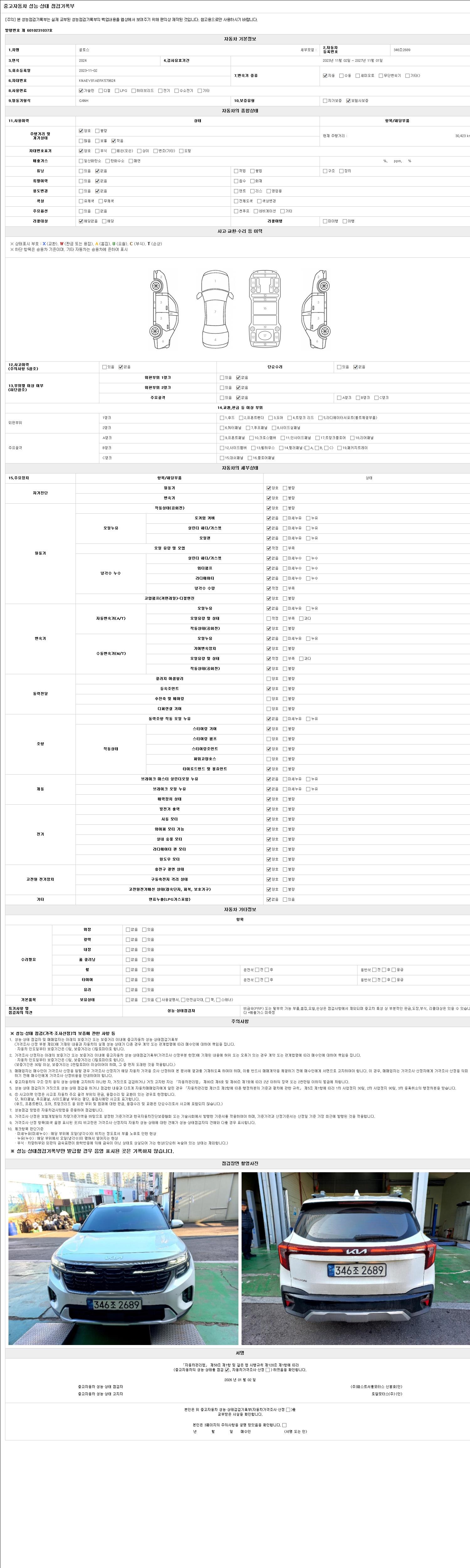 | 주행거리 | 30,423 km | 차량번호 | 346조2689 | 사고유무 | 성능기록부 참조 | 제시번호 | 제 2026000117 호 |