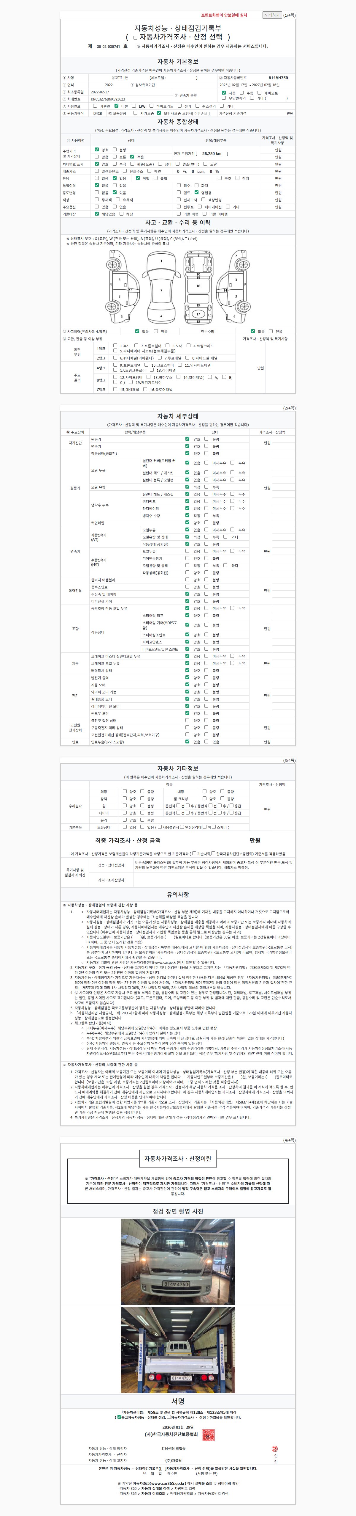 | 주행거리 | 58,280 km | 차량번호 | 814부4750 | 사고유무 | 성능기록부 참조 | 제시번호 | 제 2026003051 호 |