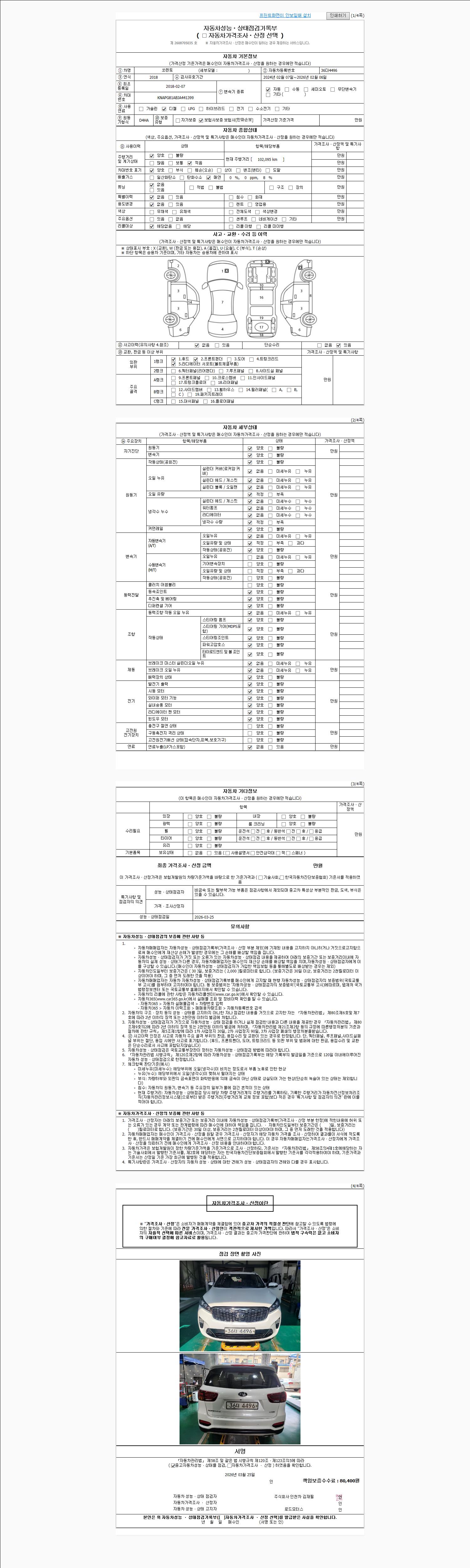| 주행거리 | 102,095 km | 차량번호 | 36더4496 | 사고유무 | 성능기록부 참조 | 제시번호 | 제 2026007530 호 |